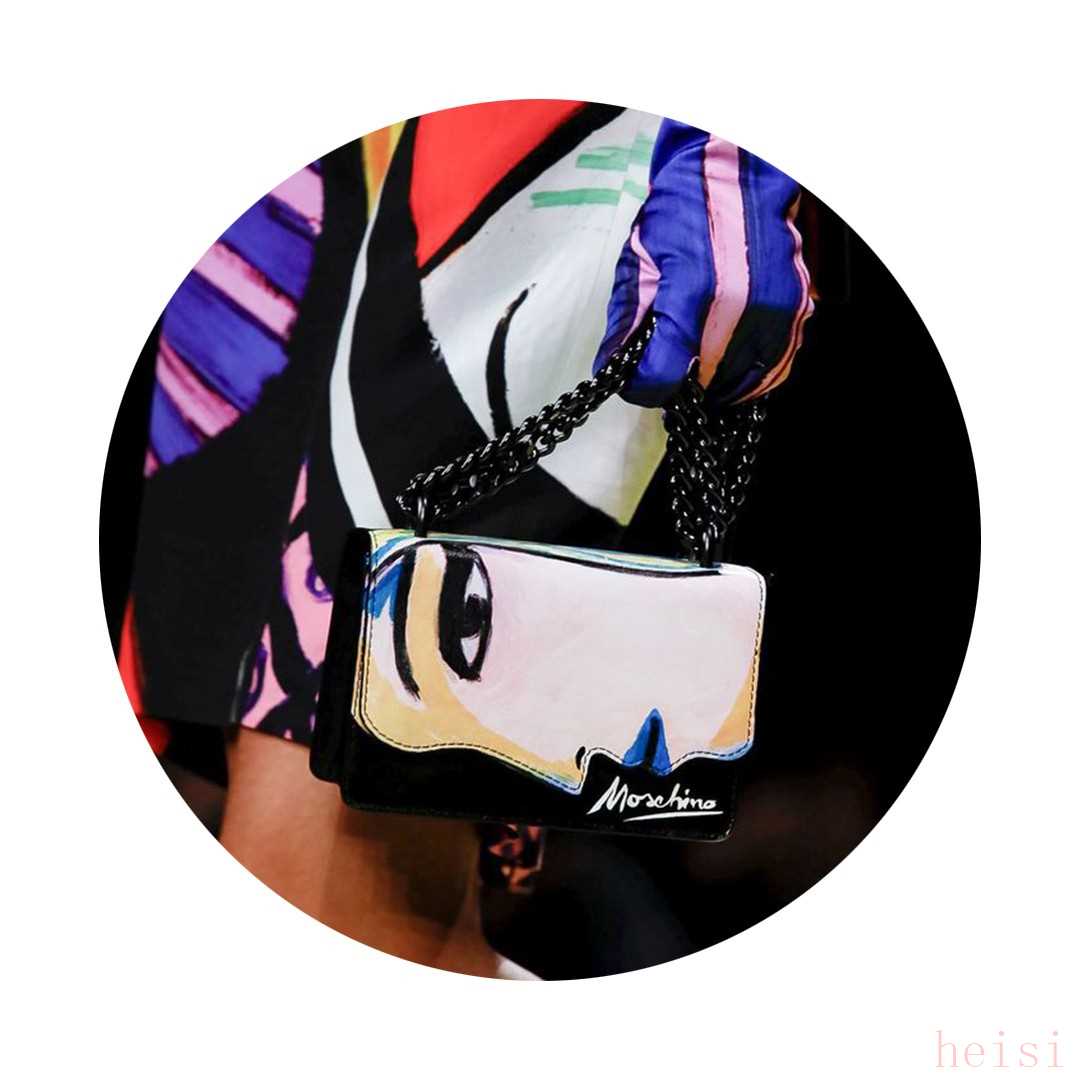 Moschino的手袋一向以有趣的造型喚起我們的童心,這一次,手袋沾染上了畢加索的藝術(shù)氣息,紛紛裹上油畫的外衣。油畫板、油畫女人側(cè)臉、抽象的幾何圖形,都完美平衡了摩登和藝術(shù)。
