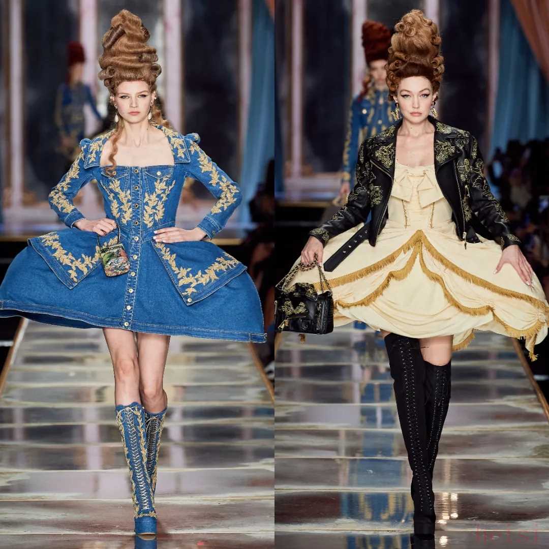 高聳發(fā)髻真實還原了洛可可時期的發(fā)型。風衣、牛仔、皮衣這些現(xiàn)代面料款式都以夸張戲劇化的方式呈現(xiàn)。