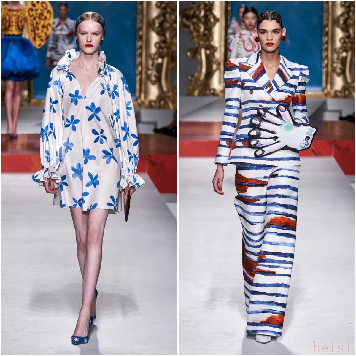 同樣的怪誕畫風在2020秋冬成衣系列中再次出現(xiàn)。這一季的靈感是洛可可藝術,結合了洛可可服飾典型的浮夸特點。