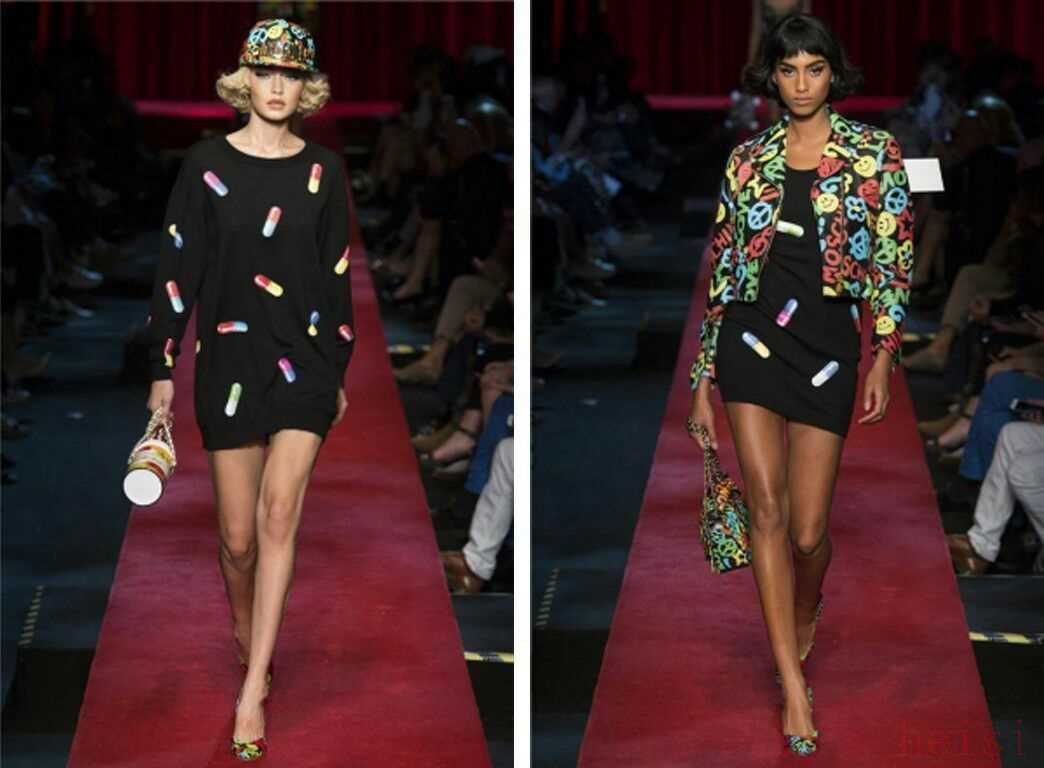 怪誕的畫風也許過于彈眼落睛,然而在Moschino的世界里,即使是相對收斂的設計依舊能以創(chuàng)意取勝。用“萬物皆可盤”來概括Jeremy Scott的設計應該是再合適不過了,比如:一顆藥丸都可以是創(chuàng)作的靈感源泉,于是就有了“藥丸系列”。