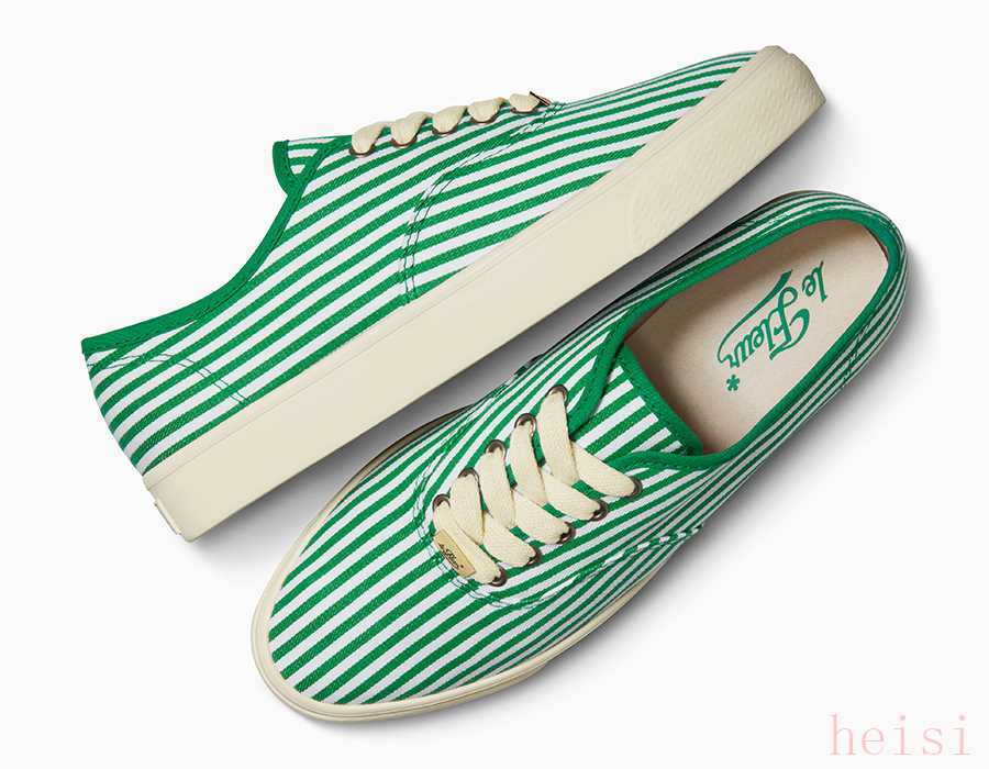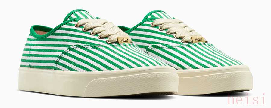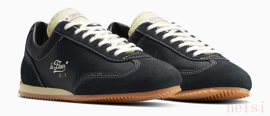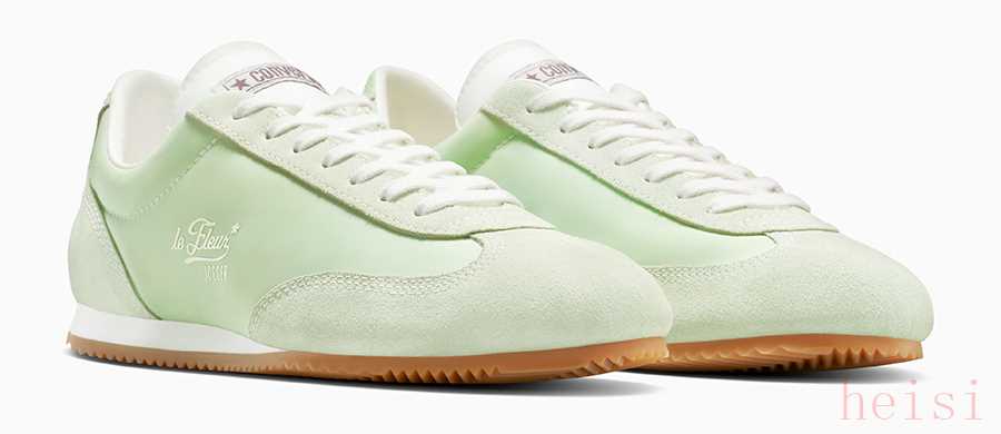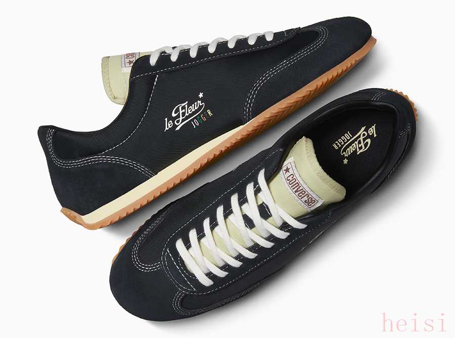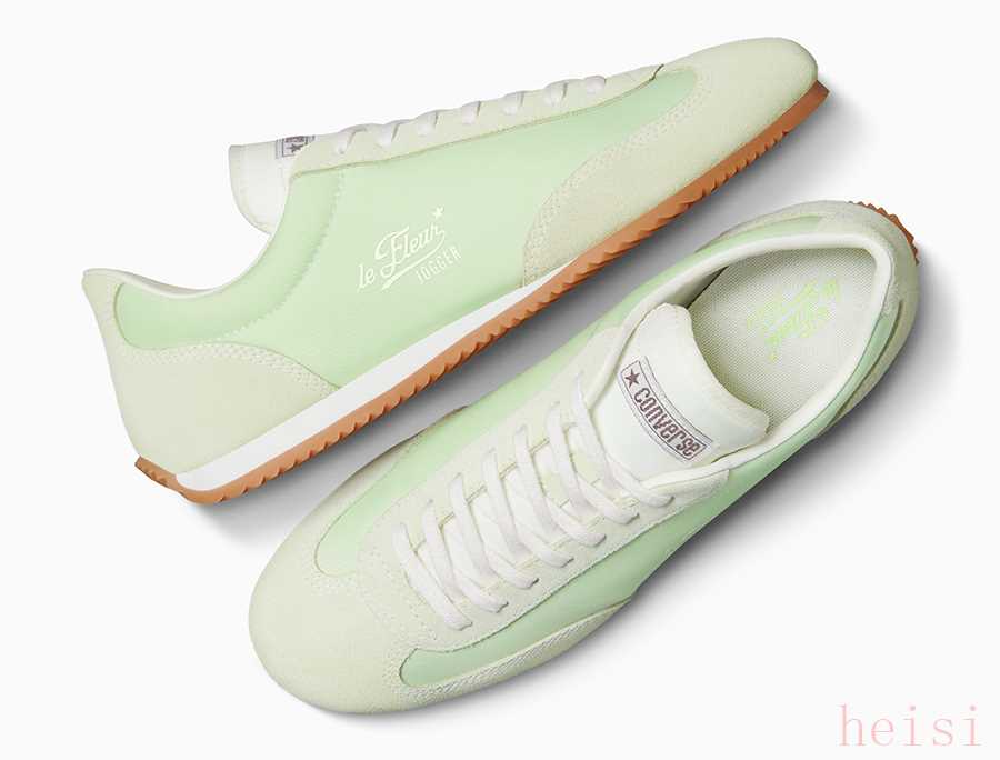 兩個(gè)鞋型都保留了原本的外觀輪廓,同時(shí)加入了 Tyler 標(biāo)志性的配色語言。1908 Jogger 有暗影黑和薄霧綠兩個(gè)配色選擇,鞋面采用了翻毛皮和編織尼龍拼接的設(shè)計(jì),搭配蜂蜜棕鞋底。1908 Naut-1 的綠白雙色棉質(zhì)條紋鞋面帶有清新的航海風(fēng)。兩款的鞋身都有 GOLF le FLEUR* 標(biāo)志表明身份。