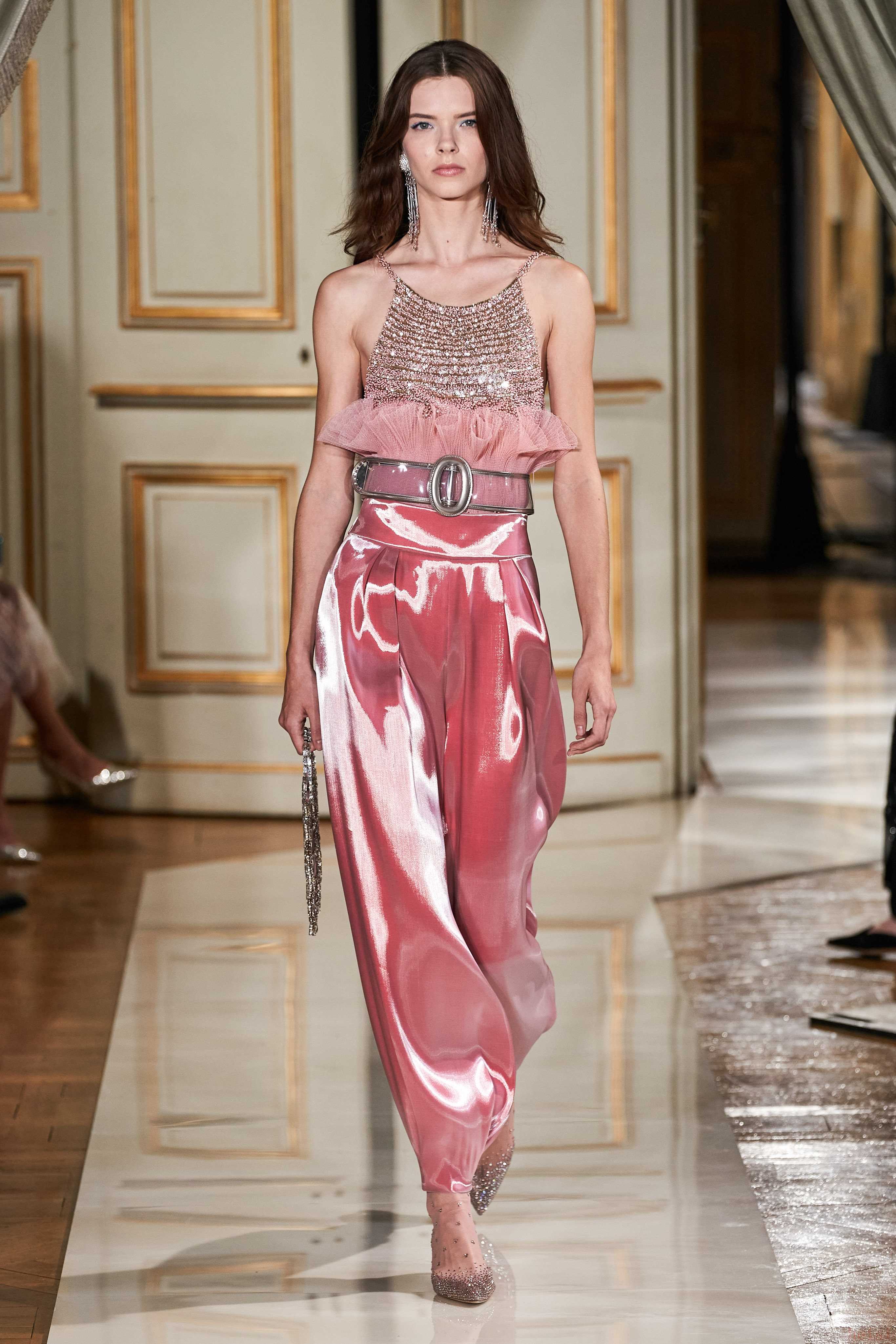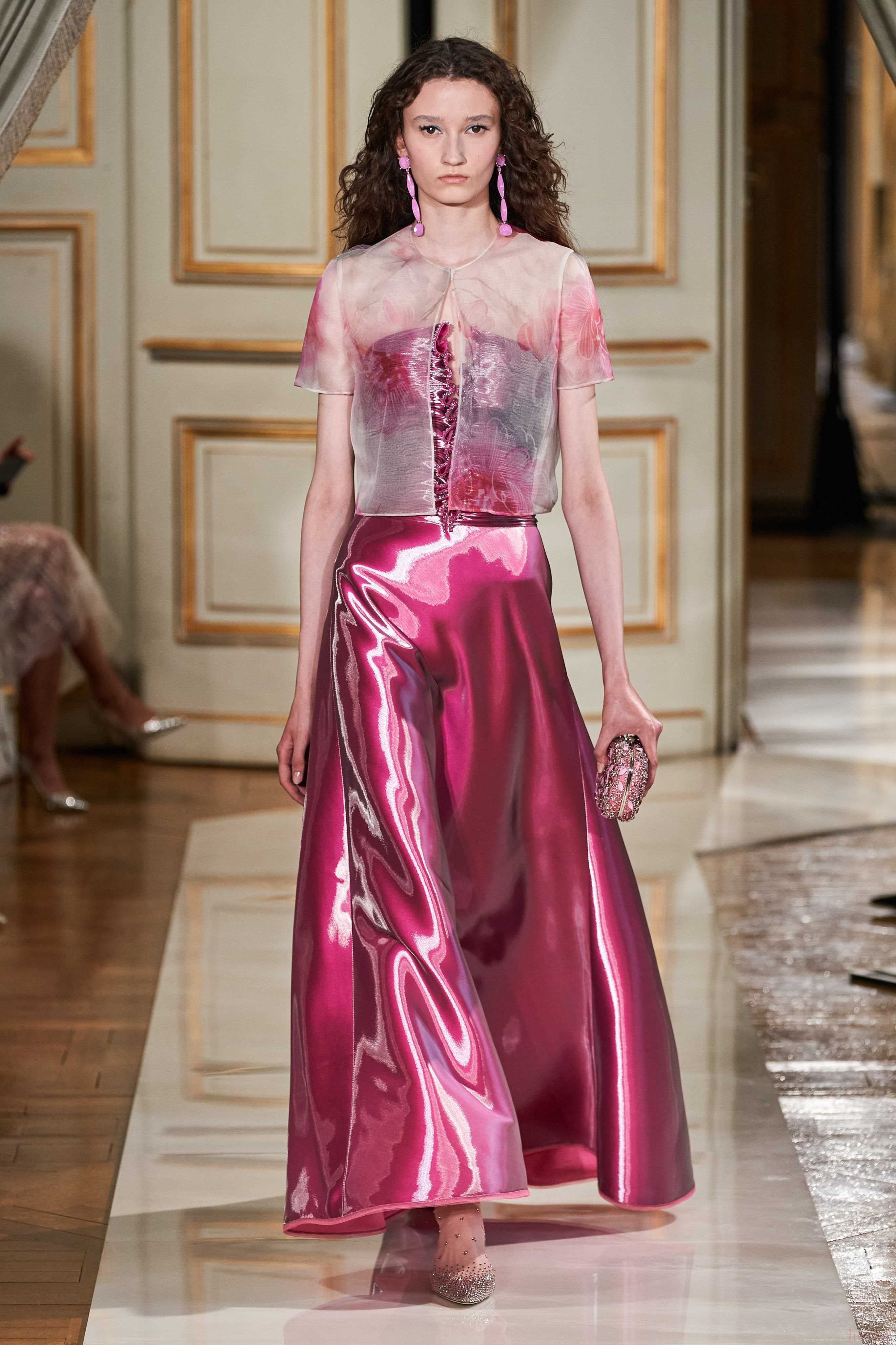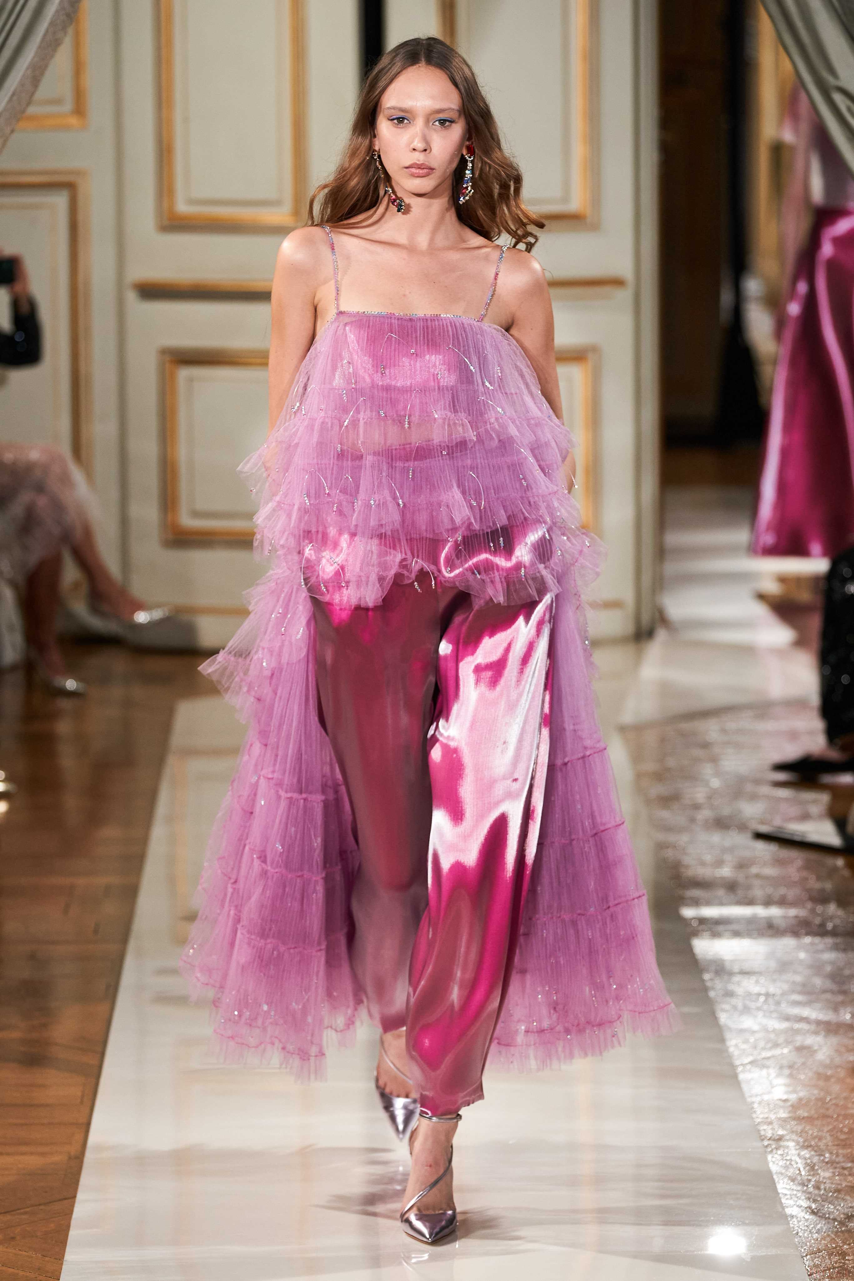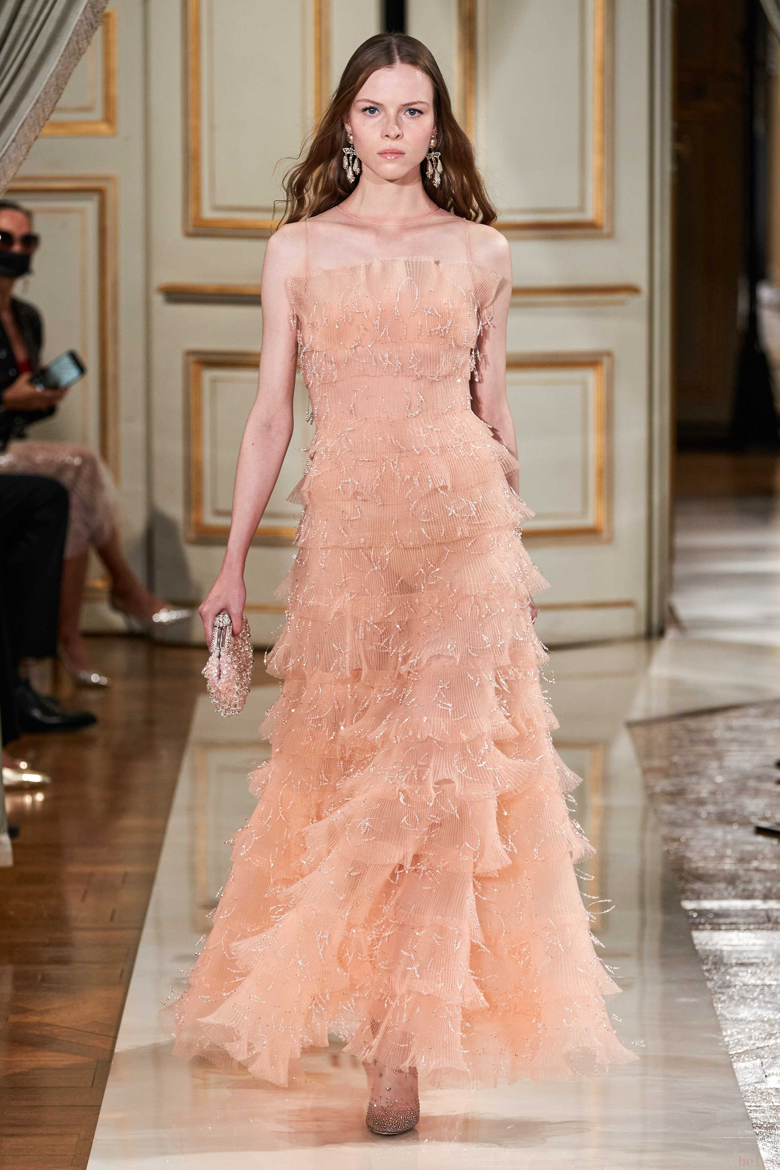 粉色美麗的,多層疊式長裙,模特完全融入到成為場上焦點(diǎn)的氛圍當(dāng)中