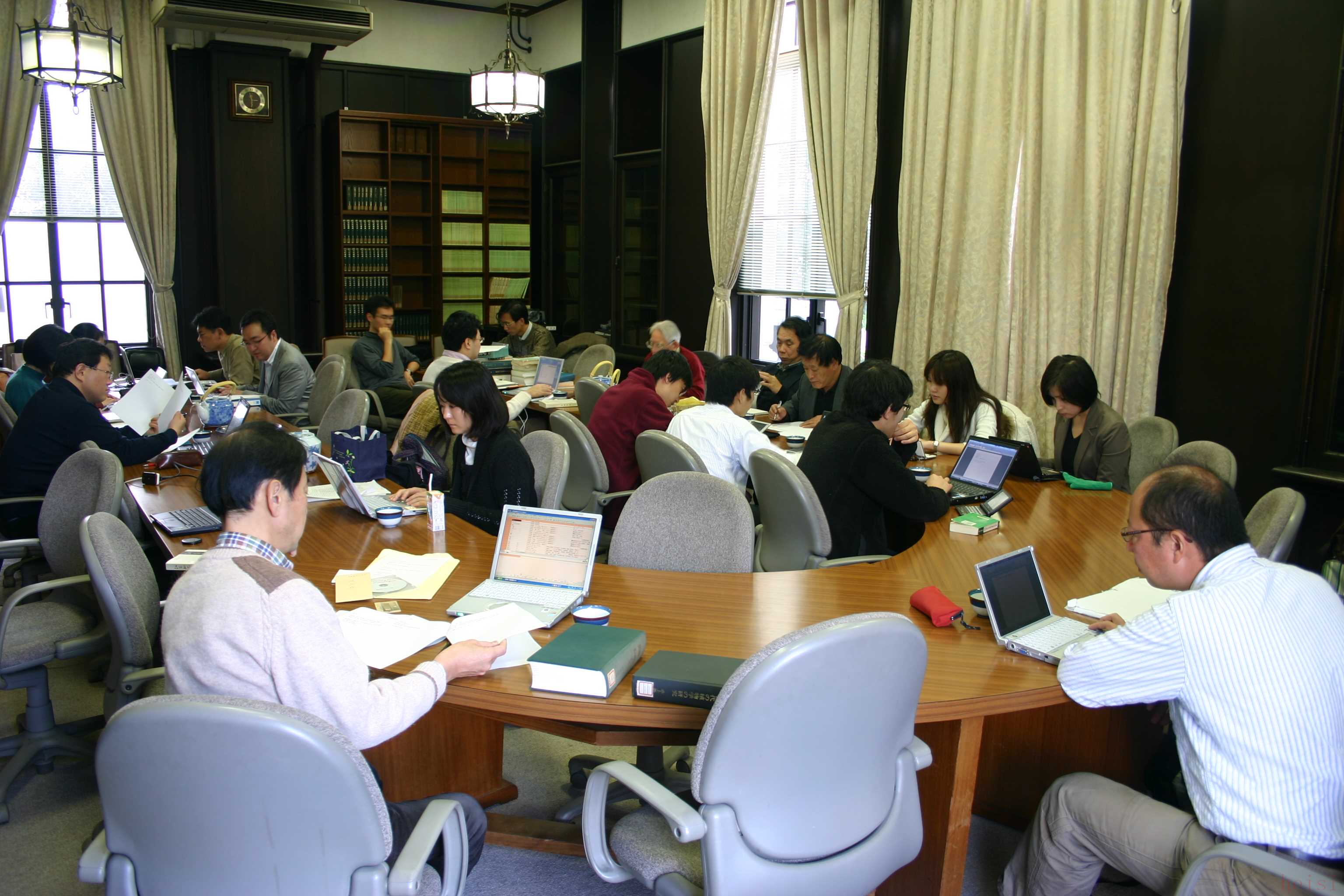 漢簡語匯研究班。時為2010年12月3日,地點是京大人文研北白川館會議室。照片左下為班長冨谷至,右下為報告人佐藤達(dá)郎。