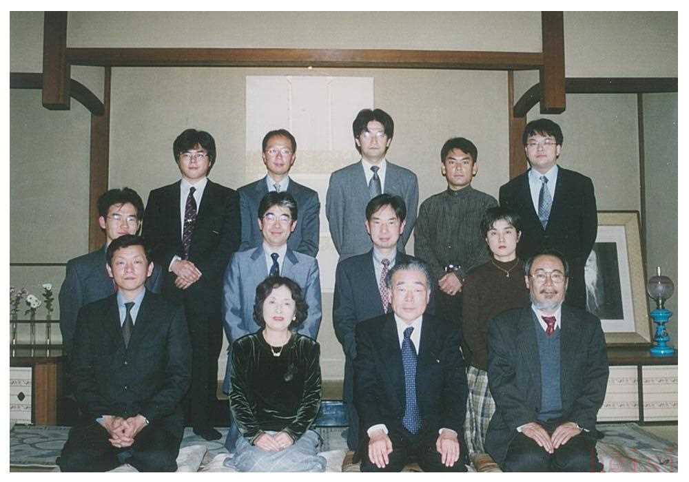2004年,永田英正古稀祝壽會。前排從左至右為籾山明、永田夫人、永田先生、大川俊?。恢信艦樯纫粯?、藤田高夫、冨谷至、角谷常子;后排為米田健志、佐藤達(dá)郎、宮宅潔、鷹取祐司、藤井律之。