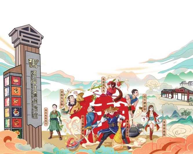 最終,設(shè)計團(tuán)隊決定以古風(fēng)和“美食江湖”的概念來進(jìn)行整體設(shè)計。插畫師根據(jù)人物個性設(shè)計食店老板形象,7個基于店家經(jīng)營者真實(shí)形象設(shè)計出來的江湖人物形象寫實(shí)傳神,7位江湖“廚神”繪在一張海報上,充分展示出“一山一食街,一鋪一廚神,一味一江湖,一人一故事”。