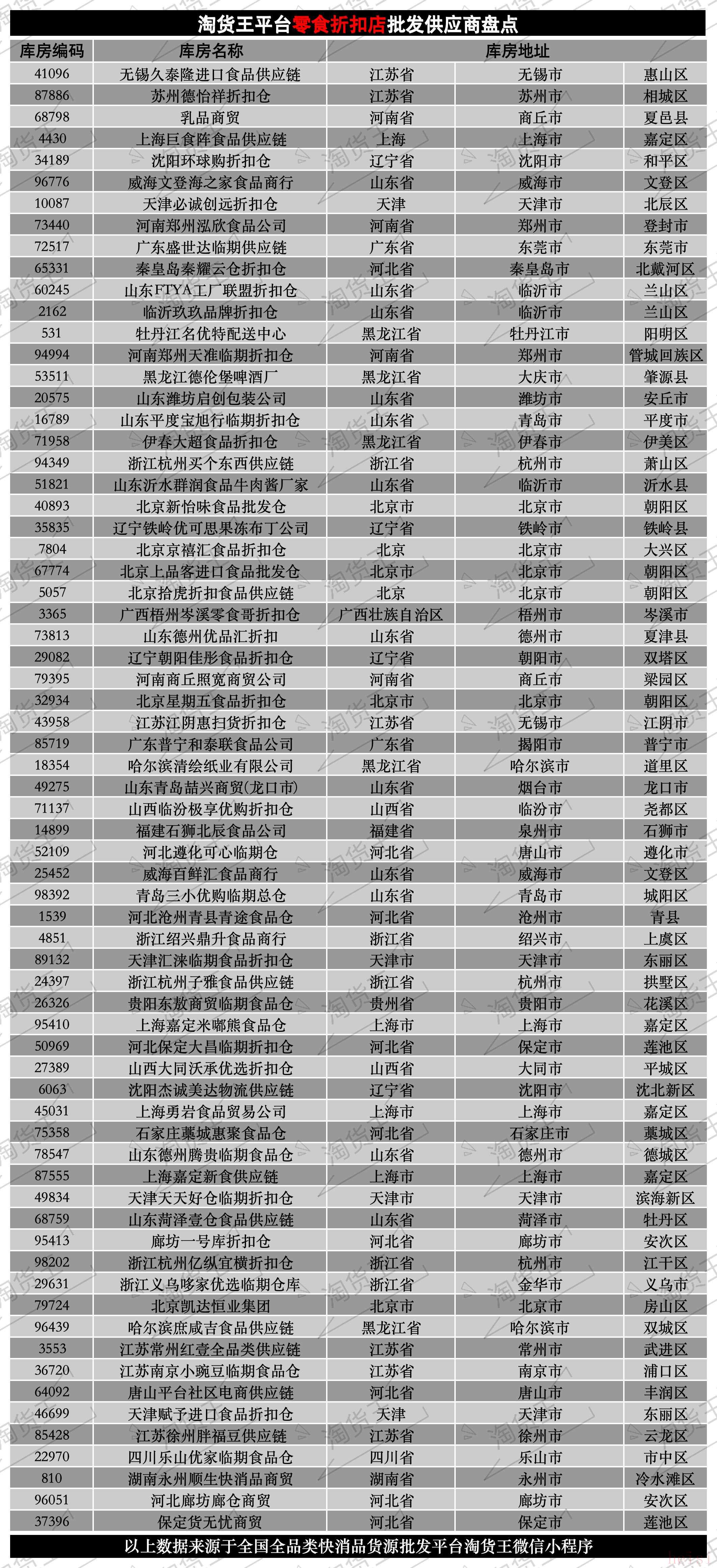 大家好,我是全國全品類快消品貨源批發(fā)平臺(tái)淘貨王的田云。近期,許多計(jì)劃開設(shè)零食折扣店的朋友都在關(guān)注貨源問題。實(shí)際上,全國零食批發(fā)渠道十分豐富,淘貨王匯聚了全國數(shù)千家專業(yè)的零食批發(fā)供應(yīng)鏈進(jìn)貨渠道,覆蓋天津武清區(qū)、安徽合肥、重慶沙坪壩、西安未央?yún)^(qū)、上海金園路、北京張臺(tái)路等多地,我給大家盤點(diǎn)整理出來了一部分,看下圖,大家想要找這些供貨商的話進(jìn)入淘貨王后在其首頁搜索框直接搜圖上標(biāo)出來的庫房編碼或者庫房名稱就能找到對(duì)應(yīng)的供貨商拿貨。