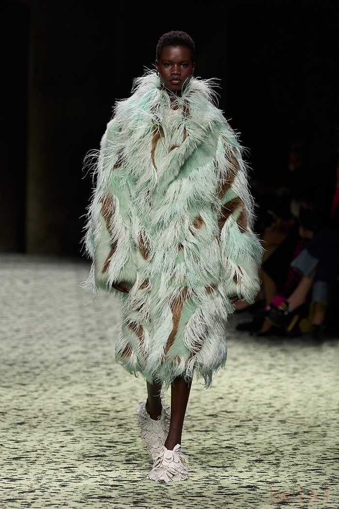 時裝系列和秀場的呈現(xiàn)宛如一場精致的拼接游戲,以創(chuàng)新型剪裁和工藝,以及多樣的廓形和技法,描繪出異想世界的奇妙生物。絨毛提花和Intreccio編織工藝被重新演繹,幻化為魚鱗和羽毛,綴于服裝和皮具之上。Murano玻璃則化身Sardine手袋上的透明手柄,呈現(xiàn)出鮮活靈動的豐富形態(tài)。