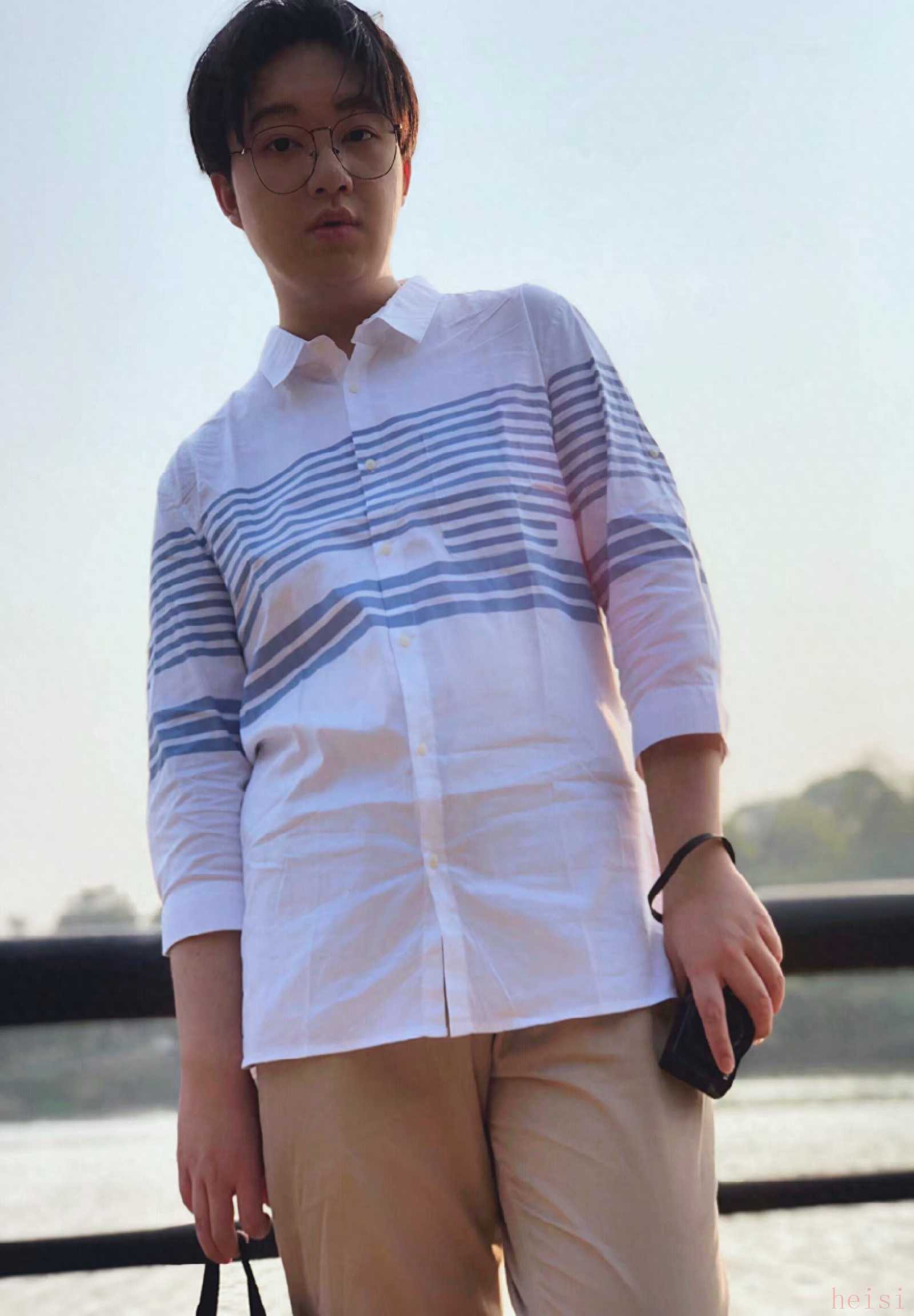 這就是一件比較清新的白襯衫~ 淺藍(lán)色條紋也是小清新的代表設(shè)計(jì)了~ 很容易皺穿之前最好熨一熨~ 襯衫洗后最好不要疊 掛著會好很多~ 搭配了一條卡其色的九分褲 一雙小白鞋 仿佛在與春天末尾告別 迎接初夏的年輕小伙子~