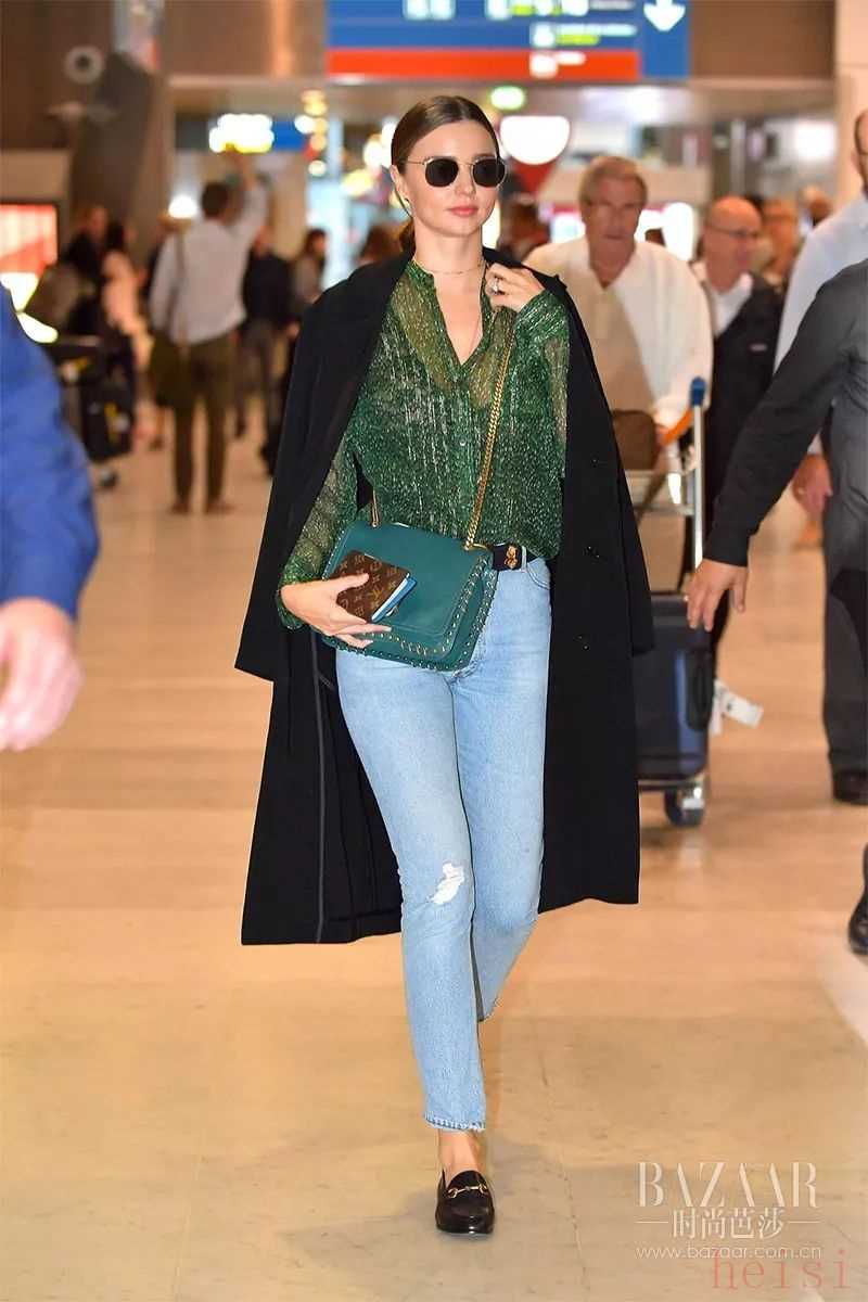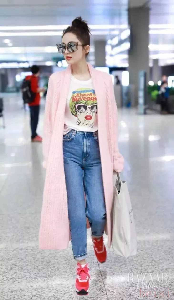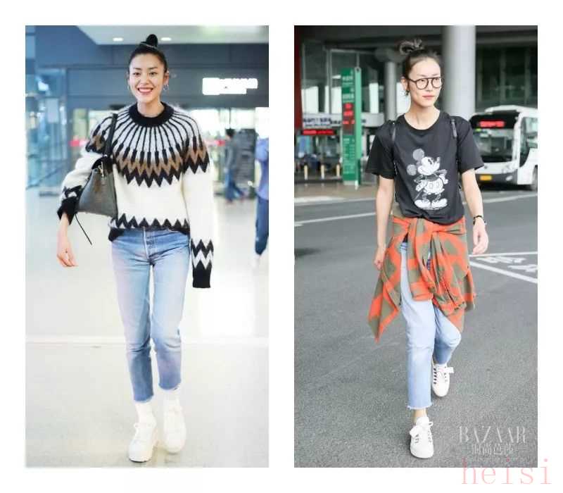 劉雯前幾天在機場就又穿了一條新的RE/DONE,露出綠色的高筒襪踩著小白鞋元氣滿滿。