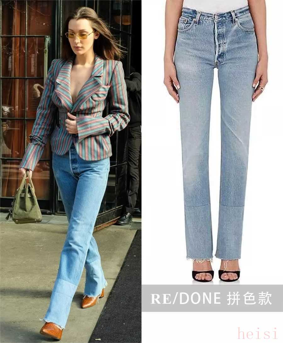 最近被Bella穿出門不下三次的RE/DONE是這條有一大截“積木色塊”的款式。