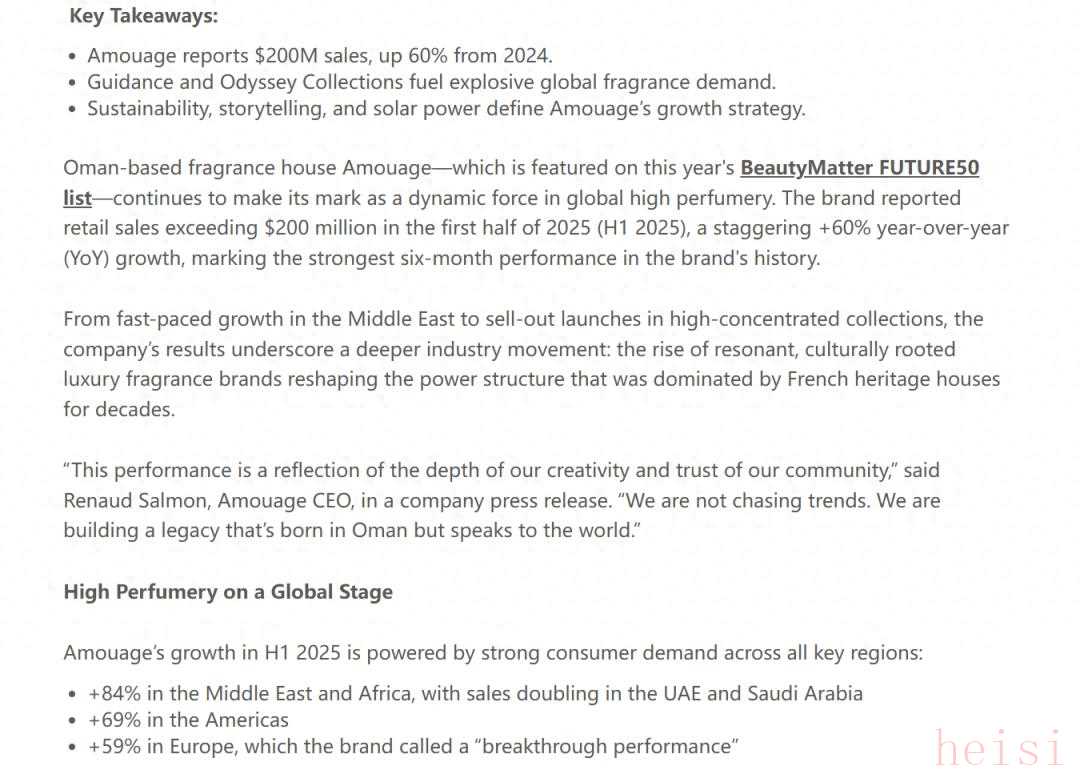 文丨鄒欣晨八月熱浪蒸騰,而比氣溫更灼熱的是中東奢華香水品牌Amouage新鮮出爐的今年上半年業(yè)績——2025年上半年,該品牌零售額突破2億美元(約合人民幣14.4億元),同比激增60%,創(chuàng)下品牌創(chuàng)立42年來最強勁的半年增速。中東的“神秘力量”。