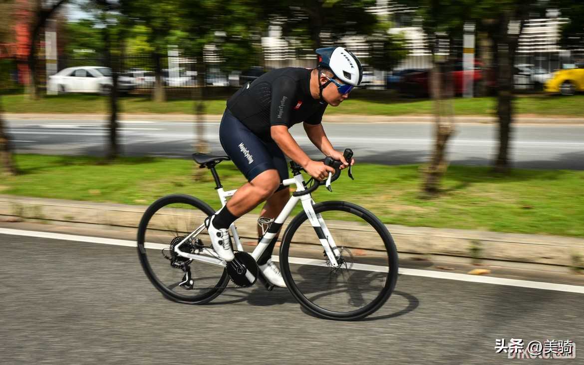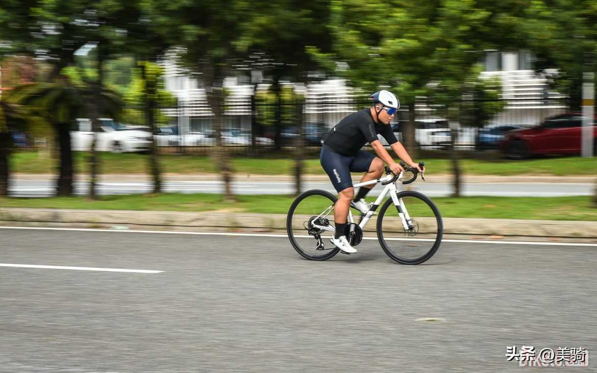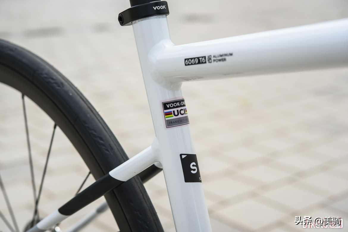 雖然官方號稱整車重量為8.3kg,但這不是整備重量。S碼的測試樣車在安裝腳踏、一個(gè)水壺架和碼表架的情況下,整備重量為8.9kg。這比一些入門級碳車的重量還要輕,就挺離譜的。作為入門車,剛性什么的并不重要,更重要的是是否“好騎”?!昂抿T”主要就反應(yīng)在重量和舒適性兩方面,是對于新手最重要的性能指標(biāo)。由于重量優(yōu)勢,VOOK ONE騎起來具有同級最強(qiáng)的輕快感,加速非常輕盈,一上車就讓小編感覺這車十分好騎,完全不像以往入門鋁車給人的印象。這不是說VOOK ONE剛性不好,它依然保持了鋁合金車架那種比較直接的發(fā)力感受。