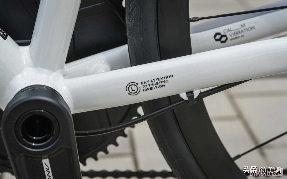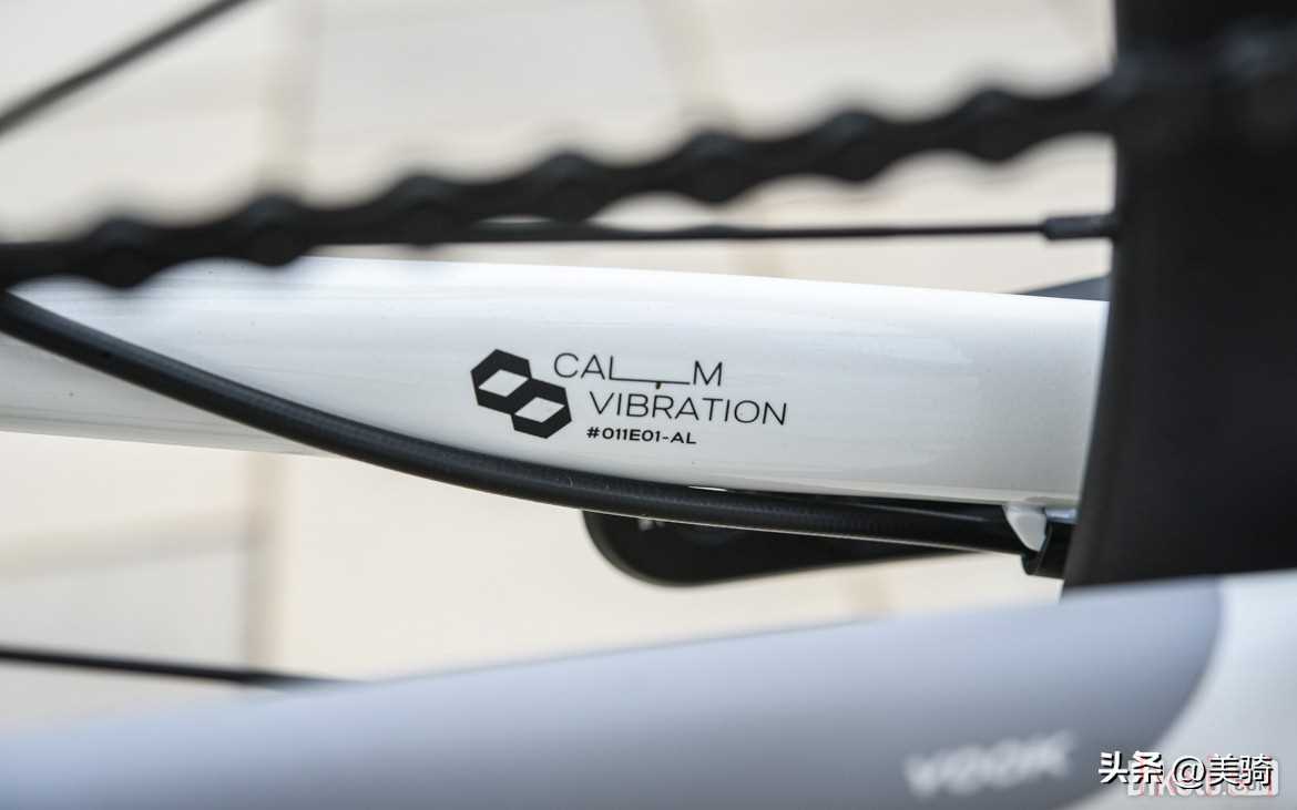 后下叉內(nèi)側(cè)的水標(biāo)字樣比較抽象,看起來像是“Calm Vibration”,應(yīng)該說的是后上叉的減震造型設(shè)計(jì)。