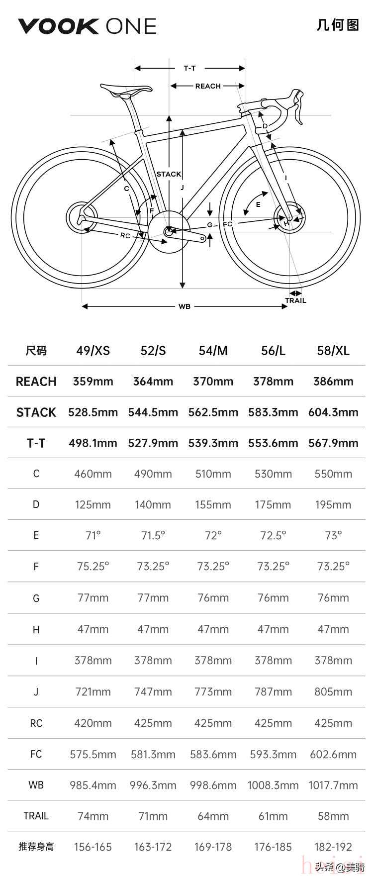 VOOK ONE提供5個(gè)車架尺寸。由于是面向新手的“年輕人的第一輛公路車”,所以幾何設(shè)定得非常友善,短Reach、高Stack的設(shè)定令車架的STR值在1.47-1.56之間,加上錐形碗組蓋的高度,可以將車把設(shè)定得很高,非常適合入門用戶。軸距也設(shè)定得比較長,提供安心穩(wěn)定的騎行感受;除最大碼數(shù)外,所有尺寸的拖曳距設(shè)定都偏大,對車輛的穩(wěn)定性也一定幫助。唯一的槽點(diǎn)是立管長度偏高一丟丟,腿短的用戶座管外露長度會少一些,外觀會沒那么好看。