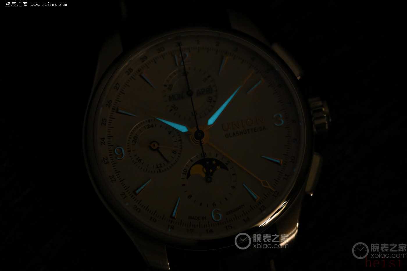 指針以及時(shí)標(biāo)覆有夜光涂層,黑暗也能清晰看時(shí)。月相盤在黑夜中看起來也是別有一番風(fēng)味。