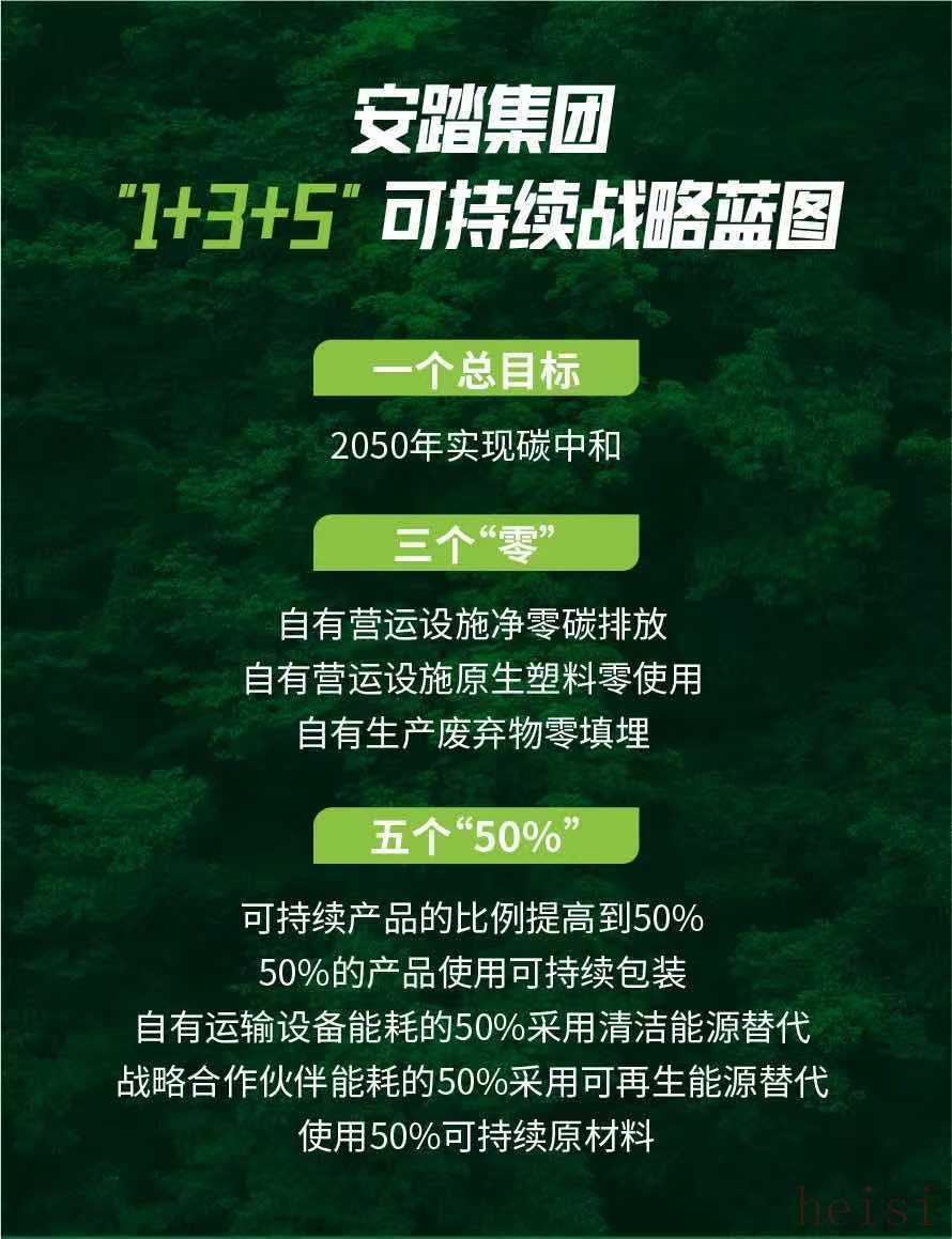 為實現(xiàn)“雙碳”目標,安踏集團將可持續(xù)發(fā)展和ESG納入公司未來十年的發(fā)展戰(zhàn)略中,制定了“1+3+5”的可持續(xù)戰(zhàn)略目標,計劃2030年前將材料、產(chǎn)品、包裝、運輸、核心供應鏈五個環(huán)節(jié)的可持續(xù)占比都提升到50%,全集團2050年實現(xiàn)碳中和。