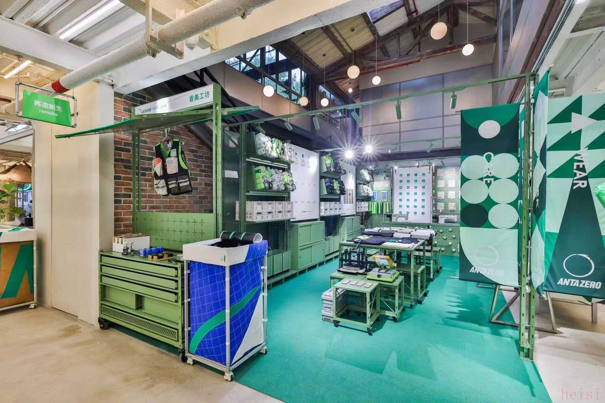 這是一次勇敢的嘗試。從裝修伊始,安踏0碳使命店就通過保留原墻體和地面、使用舊衣物和拼接布料搭建圍擋、采購二手設備以及利用舊空調(diào)燈具等方式,實現(xiàn)30%以上的減排。