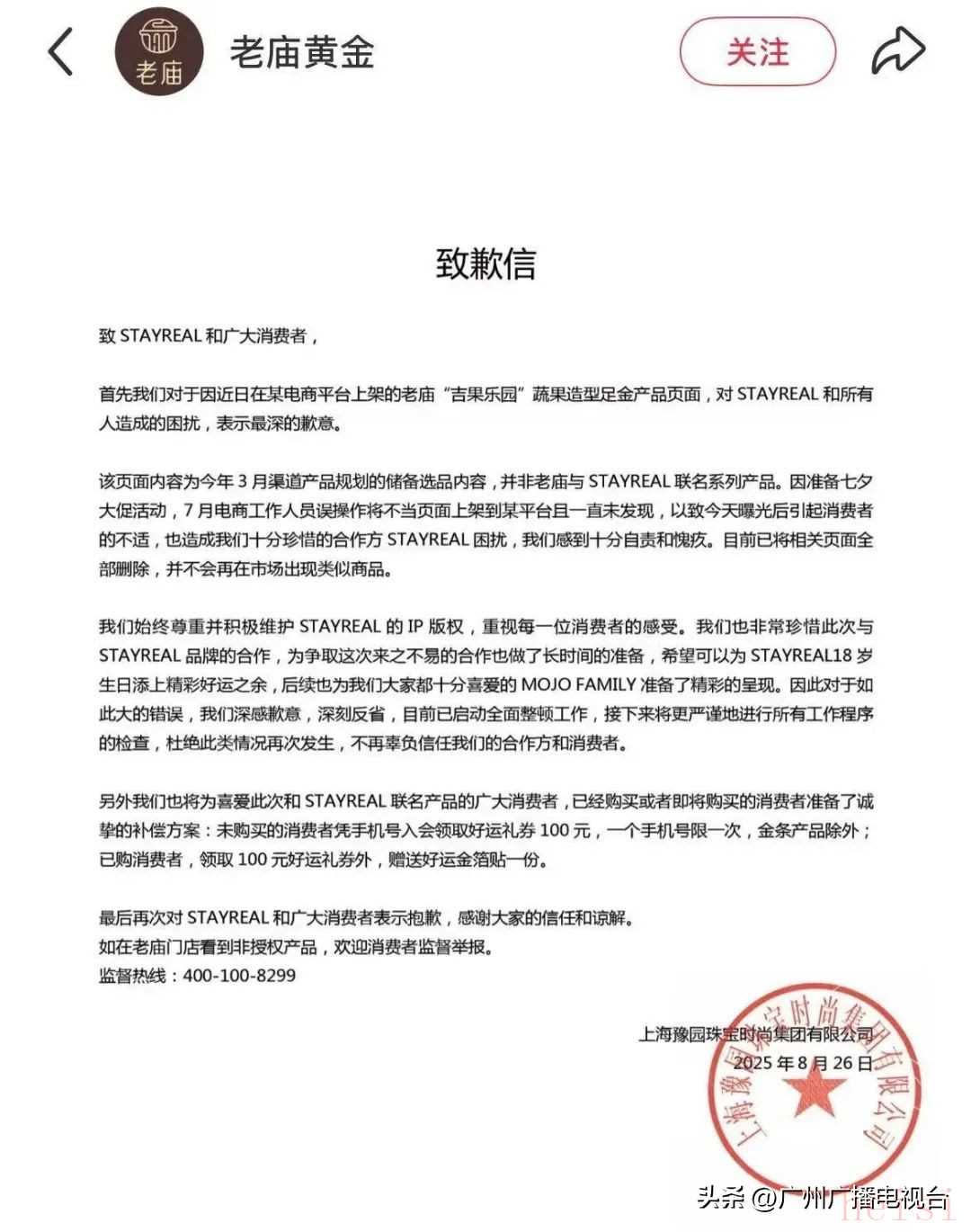首先我們對于因近日在某電商平臺上架的老廟“吉果樂園”蔬果造型足金產(chǎn)品頁面,對@STAYREAL和所有人造成的困擾,表示最深的歉意。