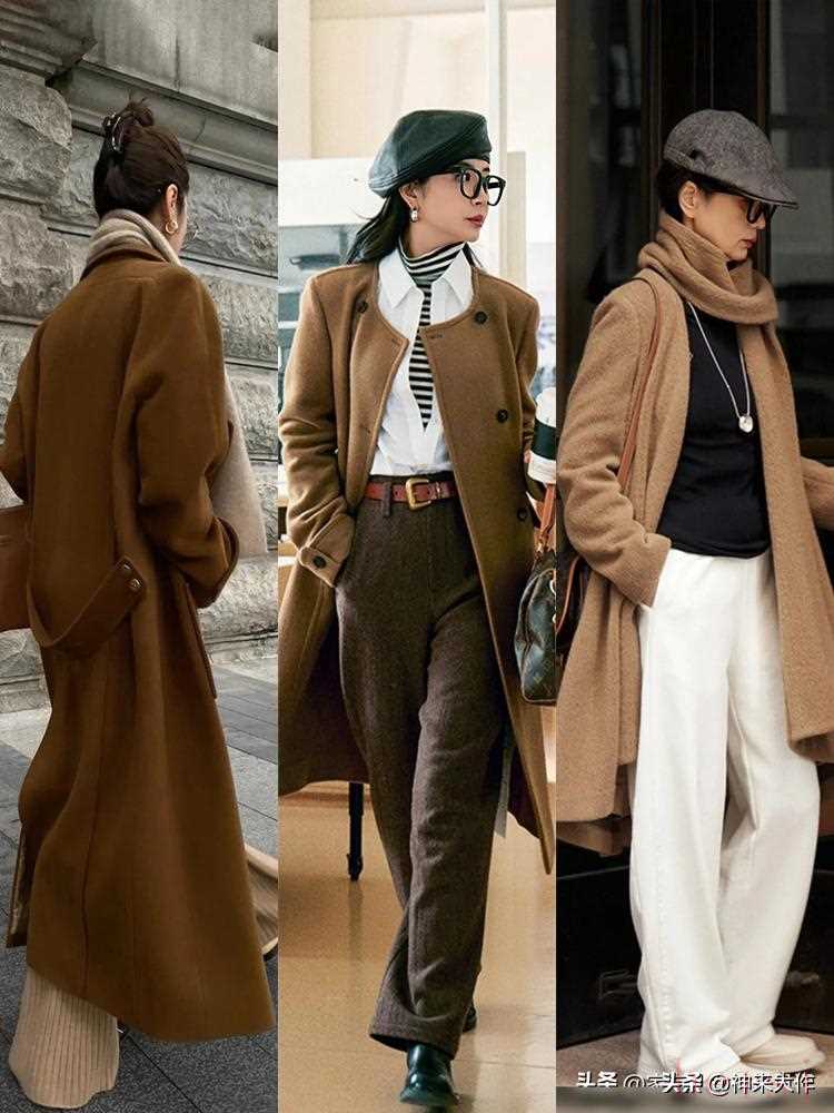 再看內(nèi)搭!別學(xué)冬天“套娃式”疊穿,焦糖色大衣本身夠吸睛,內(nèi)搭越簡單越高級。白襯衫、高領(lǐng)毛衣、條紋衫都是“萬能搭子”。記得把白色放在上半身——參考資料里說過,白色離臉近顯膚白,親測穿白襯衫比穿深色內(nèi)搭,臉至少亮兩個度。