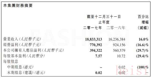 2017年,寶勝國際營業(yè)利潤同樣大跌16.6%,由2016年的9.242億元跌至7.704億元。