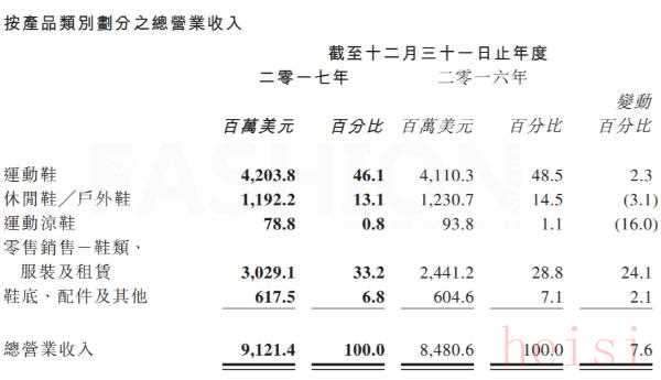 2017年全年,裕元工業(yè)營收總計91.214億美元,同比上漲7.56%,較此前公布的91.201億美元略高;其中零售業(yè)務(wù)寶勝國際營收188.333億元,同比增幅16.0%,較此前公布的162.789億元遠(yuǎn)高。