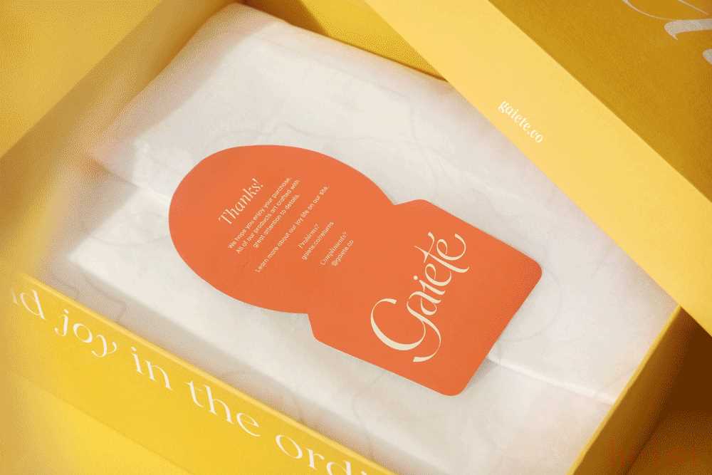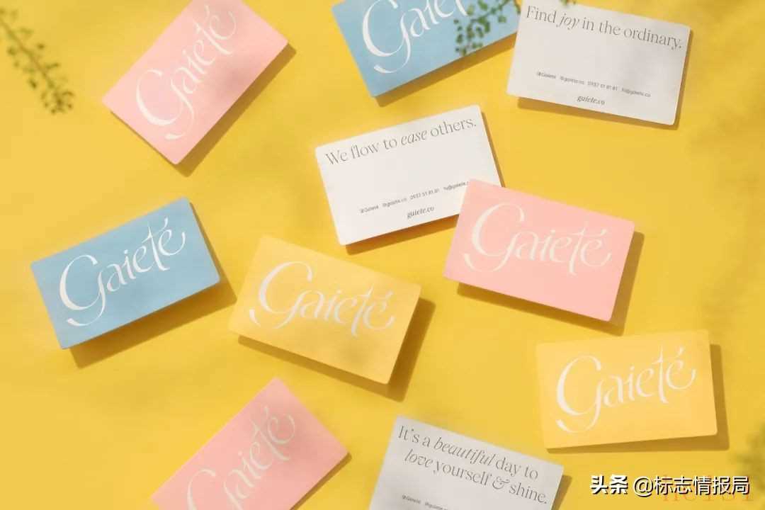Gaieté 的品牌 LOGO 沒(méi)有追隨近年來(lái)各種知名服裝品牌鐘愛(ài)的大寫(xiě)無(wú)襯線體,相反,它是一款美麗精致的手寫(xiě)風(fēng)格的字標(biāo)。更有意思的是,在稍有傾斜的字標(biāo)中,設(shè)計(jì)師在處理末尾帶尖音符的「é」時(shí),非常和諧地將「t」的橫筆畫(huà)與之共用在一起,非常和諧。