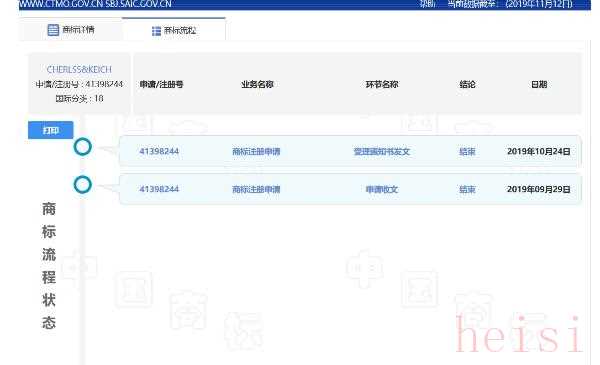 為了進一步佐證,北京商報記者在國家商報局查詢顯示,“小CK”的注冊商報于今年1月提交,目前商標狀態(tài)為“等待駁回復審”。而查爾斯?凱萁注冊商標為“CHERLSS&KEICH”,于今年9月份提交,目前商標狀態(tài)為“受理通知書發(fā)文”。