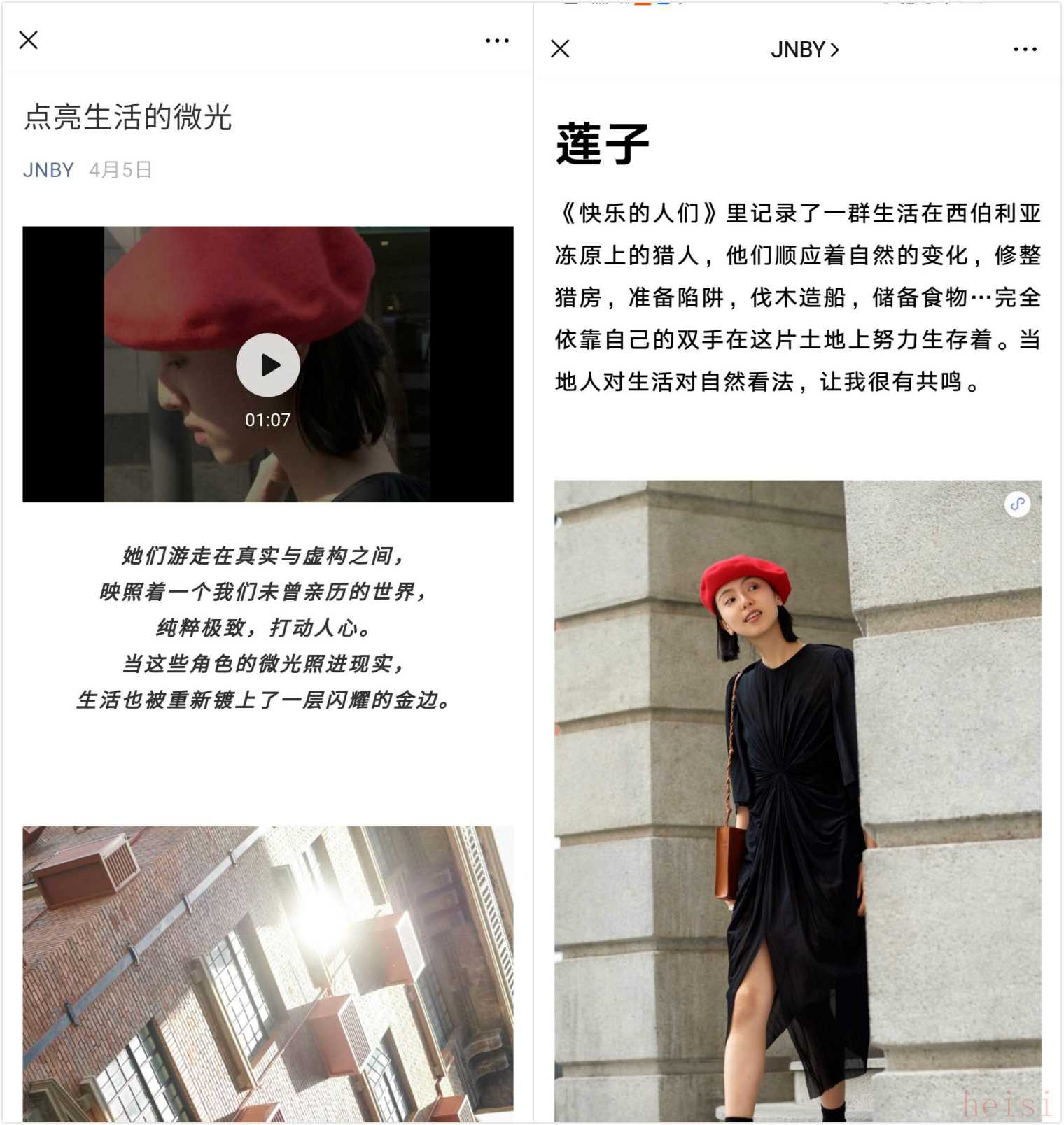 在旗下主品牌JNBY的公眾號(hào)上,很多內(nèi)容都并未直接描述產(chǎn)品,而是代入各種場(chǎng)景、心情,或是描述真實(shí)存在的人和他們的故事。有時(shí)候,內(nèi)容甚至與服裝無(wú)關(guān)。