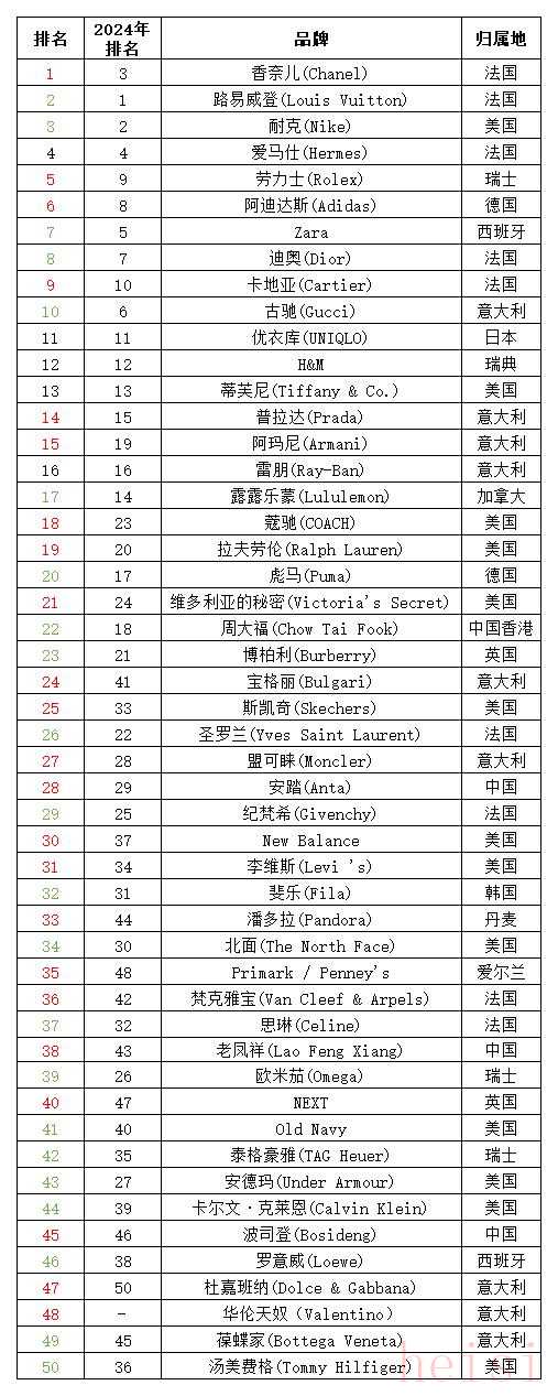 "耐克(Nike)":雖然是一家大公司,但其主要業(yè)務(wù)是運動鞋服,其品牌價值雖然很高(通常在百億至數(shù)百億美元范圍),但與頂級奢侈品牌集團的總價值或單個奢侈品牌價值相比,通常排在較后的位置,尤其與LVMH、開云、歷峰這些集團相比。