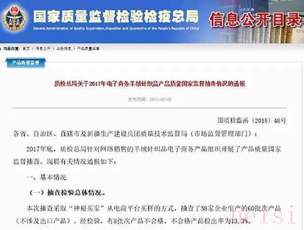 據(jù)通報,2017年底,質(zhì)檢總局針對網(wǎng)絡(luò)銷售的羊絨針織品電子商務(wù)產(chǎn)品組織開展了產(chǎn)品質(zhì)量國家監(jiān)督抽查。