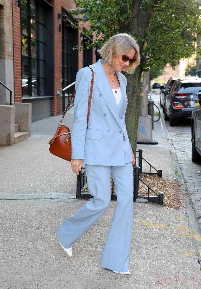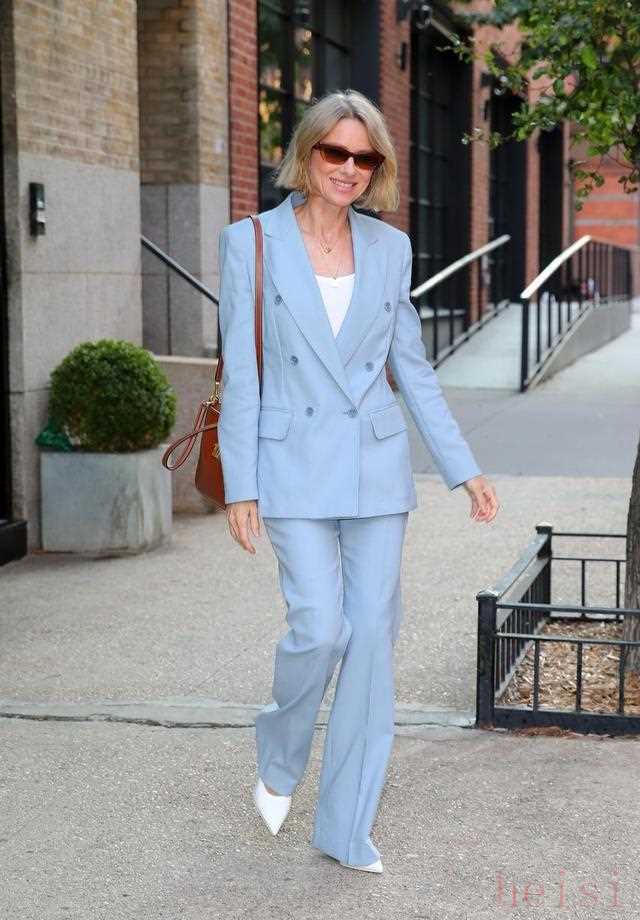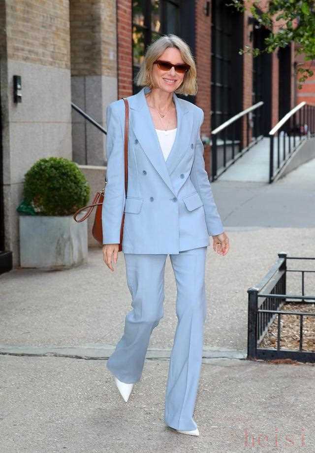 紐約那天其實(shí)挺曬,街角的紅磚墻被太陽烤得發(fā)亮,57歲的娜奧米·沃茨就這么晃過來,一身淺藍(lán)西裝像把風(fēng)兜頭澆下,涼絲絲的。