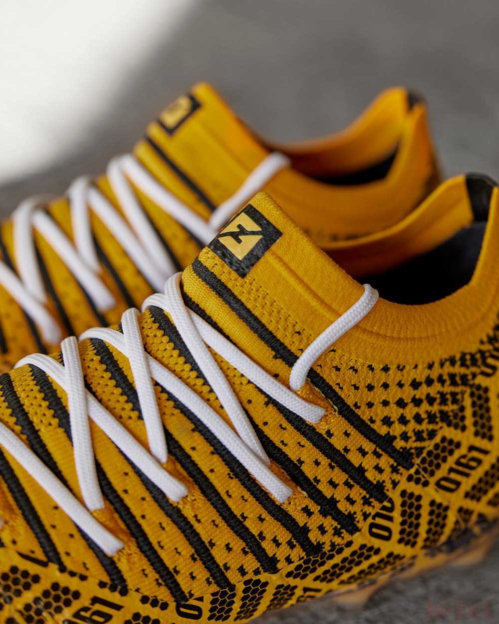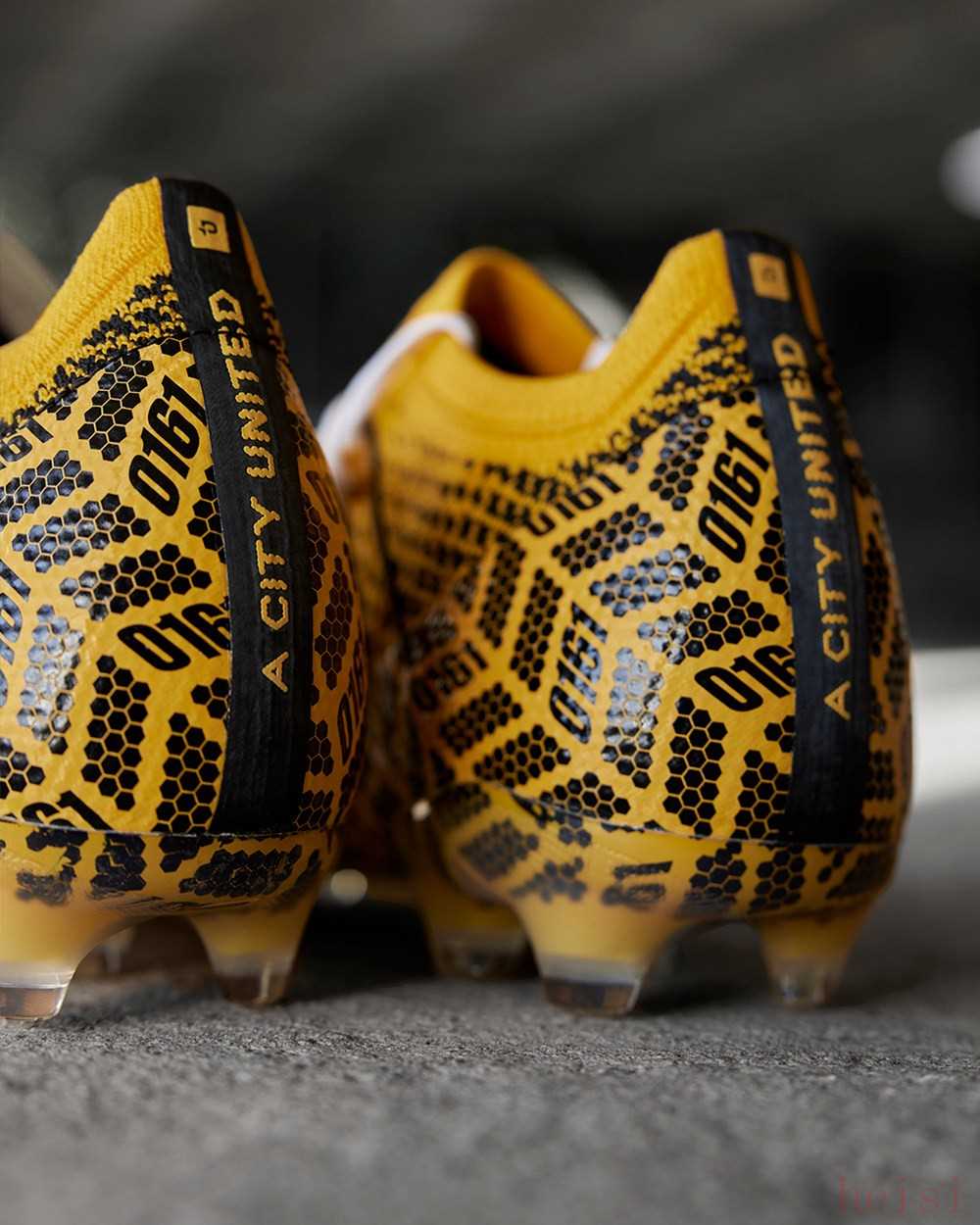 作為雙方合作打造的MCR “A City United”聯(lián)名系列中的明星產(chǎn)品,這款特別版戰(zhàn)靴將曼徹斯特電話區(qū)號0161作為設(shè)計(jì)核心元素,橘色鞋面上加入由象征著蜂巢的黑色六邊形圖形所組成的圖案以及“0161”字樣?!癆 City United”的口號則出現(xiàn)在球鞋后跟上,搭配的白色鞋帶在鞋面襯托下格外醒目。