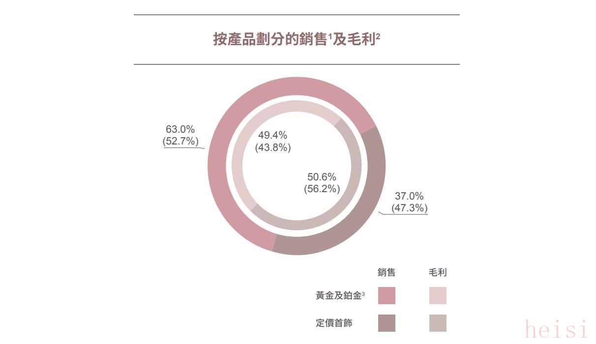 期內(nèi),黃金及鉑金銷售額增加24.6%至68.86億元,占整體銷售額的63%,相比上年占比增加超過10個百分點。定價首飾產(chǎn)品銷售額則減少18.5%至40.38億元,占整體銷售額37%。