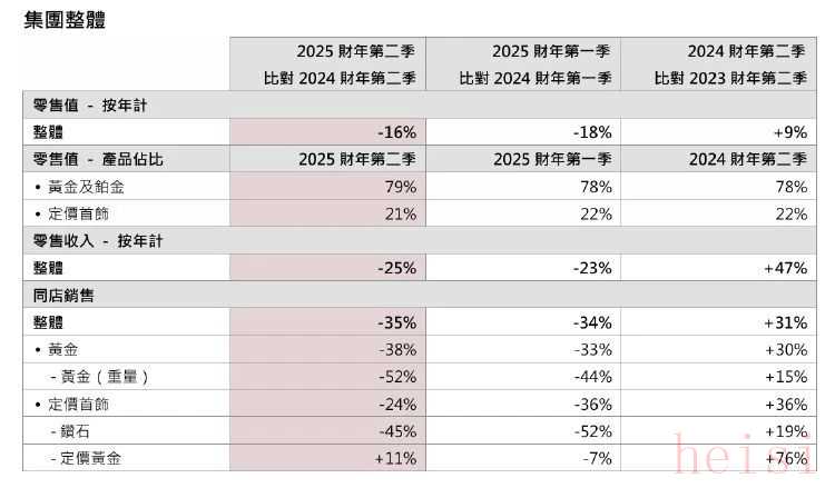 香港珠寶品牌六福集團(tuán)10月17日晚間公布最新業(yè)績(jī)數(shù)據(jù),該集團(tuán)2025財(cái)年第二季度(7月1日-9月30日)及10月首兩周整體零售值下跌16%,零售收入下跌25%,同店銷售下跌35%。黃金、鉆石首飾同店銷售分別同比下跌38%、45%。黃金及鉑金產(chǎn)品在總零售值中占比79%,定價(jià)首飾占比21%。該集團(tuán)表示,零售表現(xiàn)主要受高基數(shù)效應(yīng)及金價(jià)屢創(chuàng)新高影響,在消費(fèi)者適應(yīng)高金價(jià)后,黃金銷售有望恢復(fù)正常。