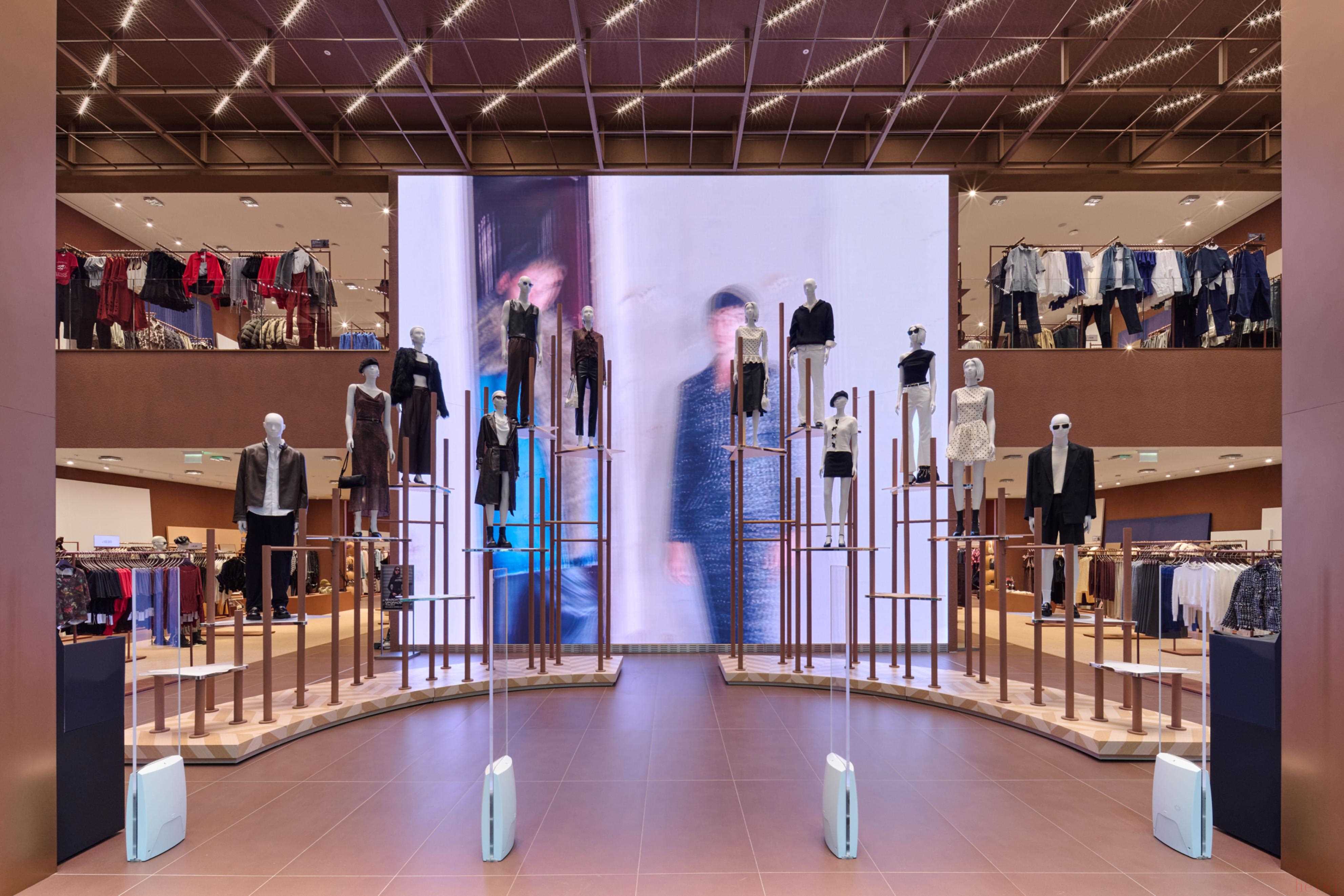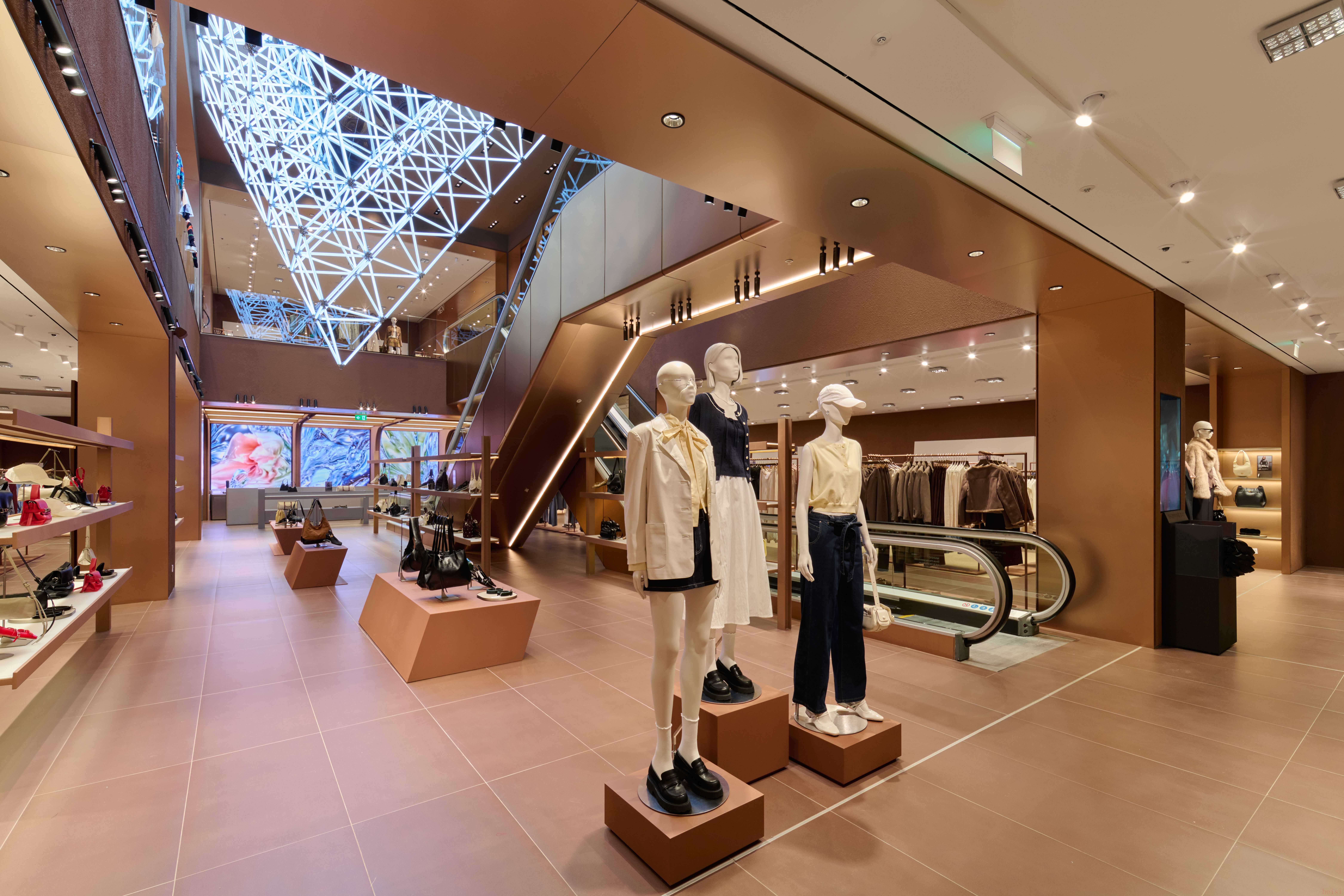 這家新店不僅體量龐大,在設(shè)計(jì)上也極具辨識度。外立面配備了一塊約12米寬的電子大屏,結(jié)合LED與玻璃材質(zhì),打造出動態(tài)變化的視覺效果,吸引眾多路人駐足。店內(nèi)融合工業(yè)風(fēng)與藝術(shù)裝置,特別設(shè)置的“棱鏡”結(jié)構(gòu)隨光線流轉(zhuǎn)呈現(xiàn)萬千光影,巧妙融匯東西方美學(xué)理念,成為一處兼具購物與打卡體驗(yàn)的時(shí)尚空間。