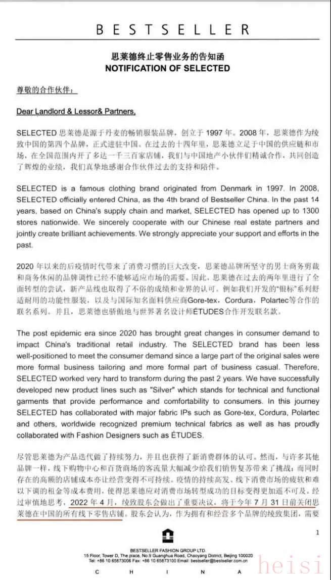5月10日,一份有關(guān)綾致集團(tuán)旗下的男裝品牌思萊德(SELECTED)終止中國零售業(yè)務(wù)的告知函在網(wǎng)上流傳。