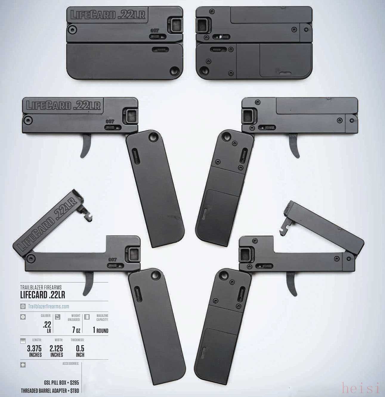 它看起來根本就不像是一支槍,合起來像是一張卡片,展開像是一把水果刀,在中間帶有一個比較小的扳機,并在扳機上面的模塊中裝入子彈,每次只能裝一顆,握把部分還能存儲3顆彈藥,發(fā)射點22LR小口徑彈藥,射程僅有20米,結(jié)構(gòu)極其簡單,便于隱藏攜帶,不打開沒人知道那是一把槍。Lifecard.22LR在北美民間屬于創(chuàng)意類槍械,多數(shù)作為把玩和收藏。