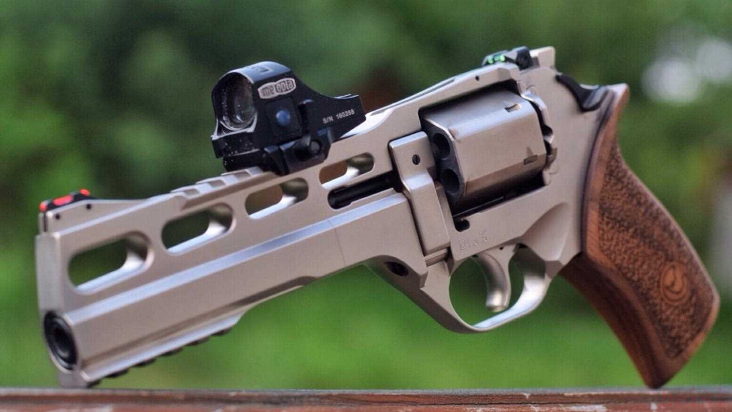 意大利齊亞帕公司研制的奇特性轉(zhuǎn)輪手槍,外形與傳統(tǒng)的轉(zhuǎn)輪手槍不同,它顯得更方正,更短小,可以發(fā)射點357馬格南彈藥、9×21毫米彈藥、和點40彈藥,彈容量為6發(fā),還分為黑色,銀色和黃金色三個版本,握把部分使用木質(zhì)材料,并可以定制圖案,槍管上下還帶有一小段皮卡汀尼導軌,可以安裝微型紅點瞄準鏡和紅外線激光指示器,由于它的外觀和威力推出,在北美民間很受歡迎。