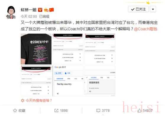 今天(12日)凌晨2點(diǎn),網(wǎng)友“虹橋一姐”在微博上爆料說:“又一個(gè)大牌蔻馳被爆出來辱華,其中對(duì)應(yīng)國家里把臺(tái)灣對(duì)應(yīng)了臺(tái)北,而香港完全成了獨(dú)立的一個(gè)板塊,所以Coach你們真的不給大家一個(gè)解釋嗎?”博文還同時(shí)@Coach蔻馳官方微博。↓