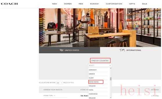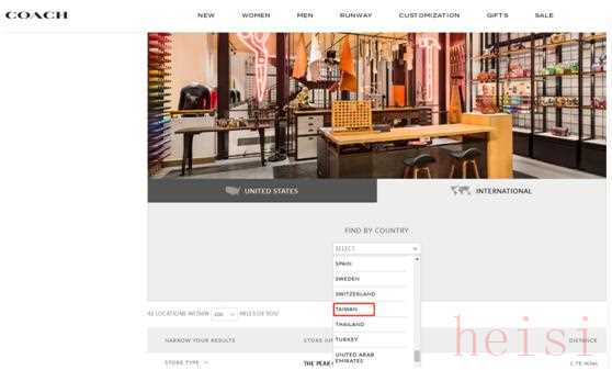 https://www.coach.com/stores)上搜索全球門店時(shí),其顯示為FIND BY COUNTRY(注:翻譯為“按國家查找”)欄目中,下拉欄赫然顯示著香港、澳門和臺(tái)灣三個(gè)地名,并與中國和美國等國家并列。