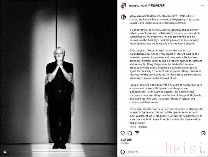 9月4日,意大利時裝設計師喬治·阿瑪尼(Giorgio Armani)離世,享年91歲。由其創(chuàng)立的奢侈品牌阿瑪尼在公告中寫道,“阿瑪尼懷著無限悲痛宣布其締造者、創(chuàng)始人及不懈推動者喬治·阿瑪尼的逝世。”