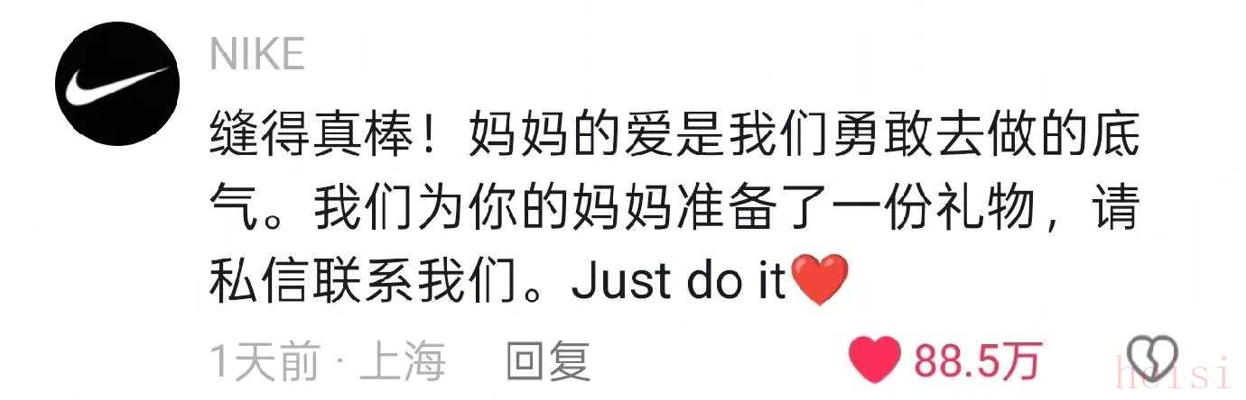 更讓人意想不到的是,耐克官方也來到評(píng)論區(qū)留言,稱贊媽媽縫得真棒,并表示媽媽的愛才是我們勇敢去做的底氣,他們還表示,要為劉媽媽準(zhǔn)備一份禮物。
