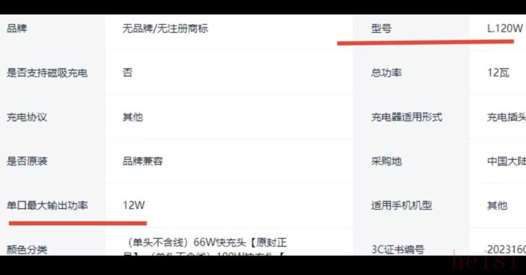 在問到120W是否為正品時,客服倒是坦言,“這個是指充電頭的型號”,記者追問實際功率,客服發(fā)來一張表格,上面的商品型號為“L.120W”,總功率12瓦,單口最大輸出功率12W。