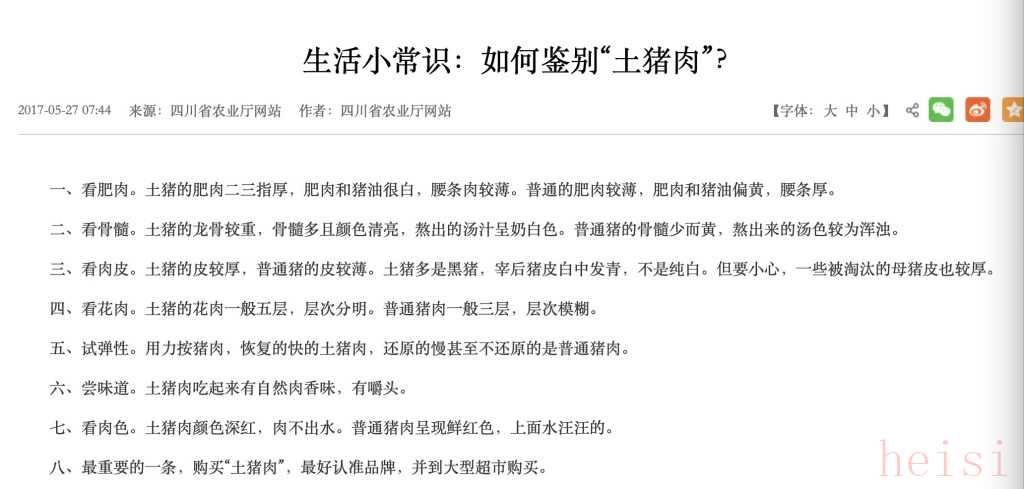四川省農(nóng)業(yè)農(nóng)村廳貼出的辨別“土豬肉”生活小常識。