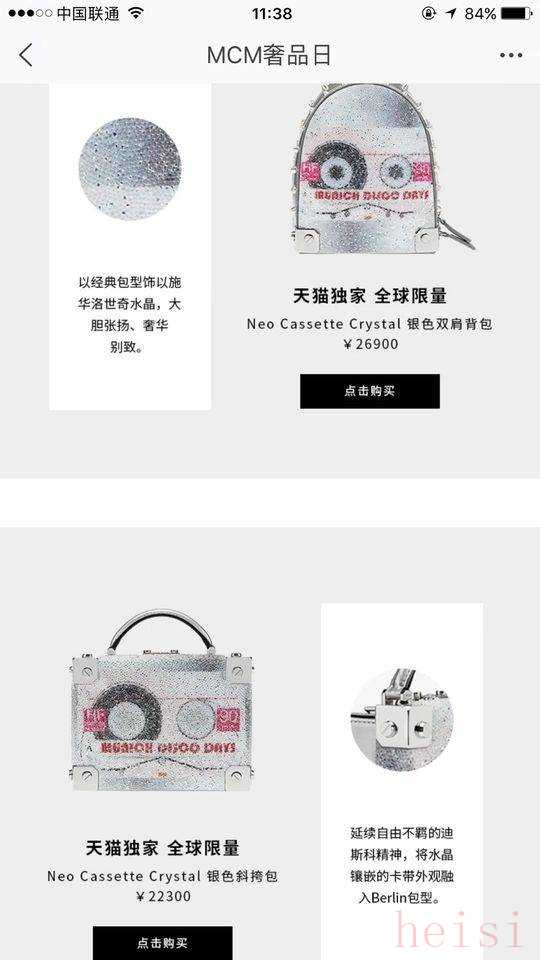 據(jù)悉,,為了和天貓合作,MCM 特意推出天貓獨(dú)家限定款——銀色超迷你雙肩包和小號(hào)斜挎包,全球只發(fā)布50個(gè)。同時(shí),這些天貓獨(dú)供款了施華洛世奇參與,在包面上鑲嵌定制水晶。此外,在MCM 的天貓旗艦店里,還會(huì)同步發(fā)售2018年秋冬新品,包括MCM LPD主推系列CASTTE 卡帶系列、LPD經(jīng)典產(chǎn)品系列 PARTICIA和初次亮相2012年春夏的爆款系列 STARK等。