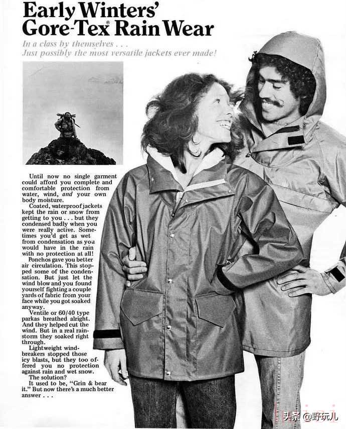 Early Winters在1976年5月推出了Light Dimension帳篷,這就是世界上第一個使用Gore-tex的帳篷。在其半年后,Early Winters推出的山地夾克Mountain Parka,被譽為世界上第一個使用Gore-tex的服裝產(chǎn)品。正是其產(chǎn)品優(yōu)異的防水透氣功能,獲得了愛好者的一致認可,其他品牌才紛紛效仿,用盡各種辦法和Gore公司進行合作,現(xiàn)在Gore已經(jīng)成為全球首屈一指的面料巨頭公司。