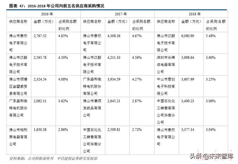 小熊電器采購(gòu)原料和零部件規(guī)格型號(hào)繁多,主要包括塑料原料、五金制品、電機(jī)、陶瓷、玻璃、包材等。 2016-2018 年,公司產(chǎn)品直接材料占主業(yè)成本比例分別為 71.62%、75.66%和 75.25%。由于小家電上游行業(yè)產(chǎn)商 眾多,競(jìng)爭(zhēng)充分,小熊議價(jià)能力相對(duì)較強(qiáng)。公司專設(shè)供應(yīng)商管理中心,與佛山泰欣、佛山漢毅等原料供應(yīng)商建 立穩(wěn)定的合作關(guān)系,同時(shí)公司對(duì)單一供應(yīng)商依賴度較低。2018 年公司向第一大供應(yīng)商采購(gòu)金額為 6080.9 萬(wàn)元,占總采購(gòu)金額的 5.48%。