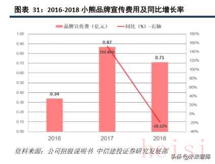 小熊重視品牌和市場(chǎng)營(yíng)銷工作,2016-2018 年品牌宣傳費(fèi)分別為 0.34、0.87 及 0.71 億元。營(yíng)銷費(fèi)用率超過(guò) 3%,其中 2017 年公司加大品牌營(yíng)銷力度,營(yíng)銷費(fèi)用率達(dá)到 5.27%。公司營(yíng)銷方式豐富多元,充分運(yùn)用電商硬廣、 影視與綜藝植入、明星代言、新媒體推廣、戶外廣告投放、論壇展會(huì)等多種渠道開展?fàn)I銷,多措并舉不斷提高品牌知名度。