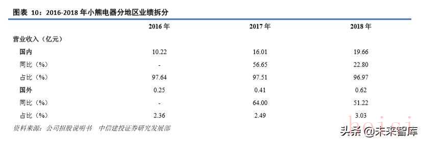 分地區(qū)來(lái)看,公司以內(nèi)銷為主,國(guó)外銷售收入穩(wěn)步增加。2016-2018 年公司內(nèi)銷收入由 10.22 億元增長(zhǎng)至 19.66 億元,營(yíng)收占比均保持在 95%以上,系公司最重要收入來(lái)源。近年公司通過(guò) ODM/OEM 方式開展境外銷 售,參加廣交會(huì)等展會(huì)并對(duì)海外優(yōu)秀小家電企業(yè)進(jìn)行開發(fā),海外客戶主要集中在俄羅斯、韓國(guó)等地。2016-2018 年公司外銷收入由 0.25 增長(zhǎng)至 0.61 億元,占比由 2.36%提升至 3.03%。