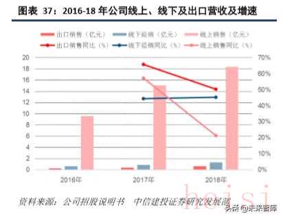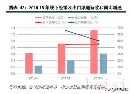 同時(shí),公司也積極布局線下經(jīng)銷與出口外銷渠道,補(bǔ)齊短板并促進(jìn)線上線下的渠道融合。2016-2018 年公司 線下經(jīng)銷及出口渠道發(fā)展快速,期間復(fù)合增速分別為 44.90%與 57.83%。2018 年?duì)I業(yè)收入分別為 1.33 億元和 0.62 億元,業(yè)務(wù)占比同比分別提升 0.98、0.54pct 至 6.55%、3.03%。